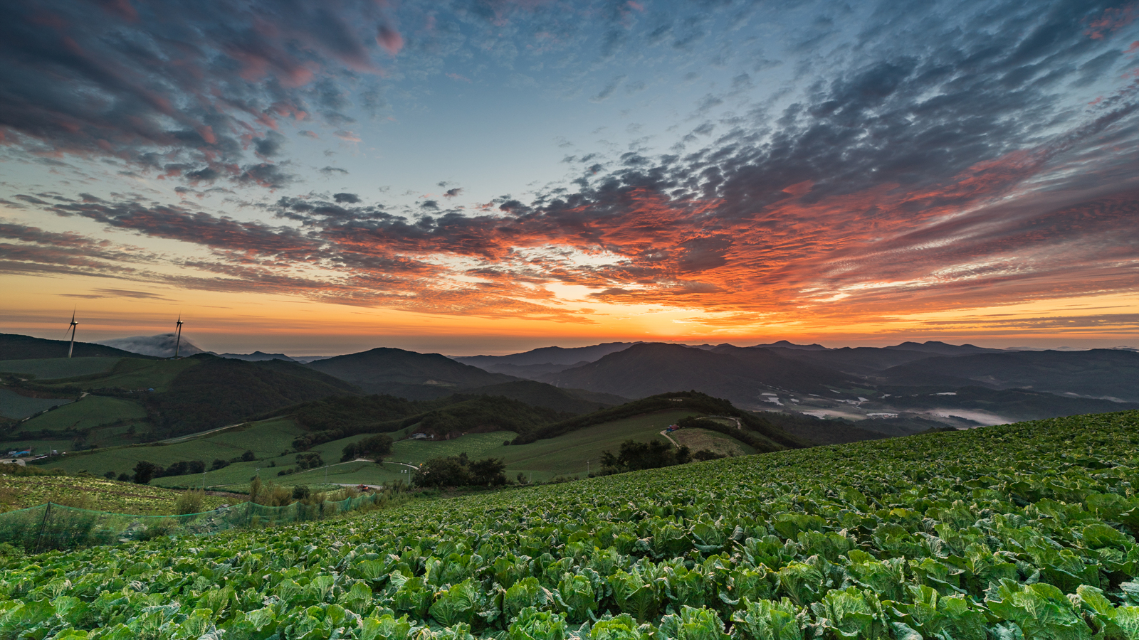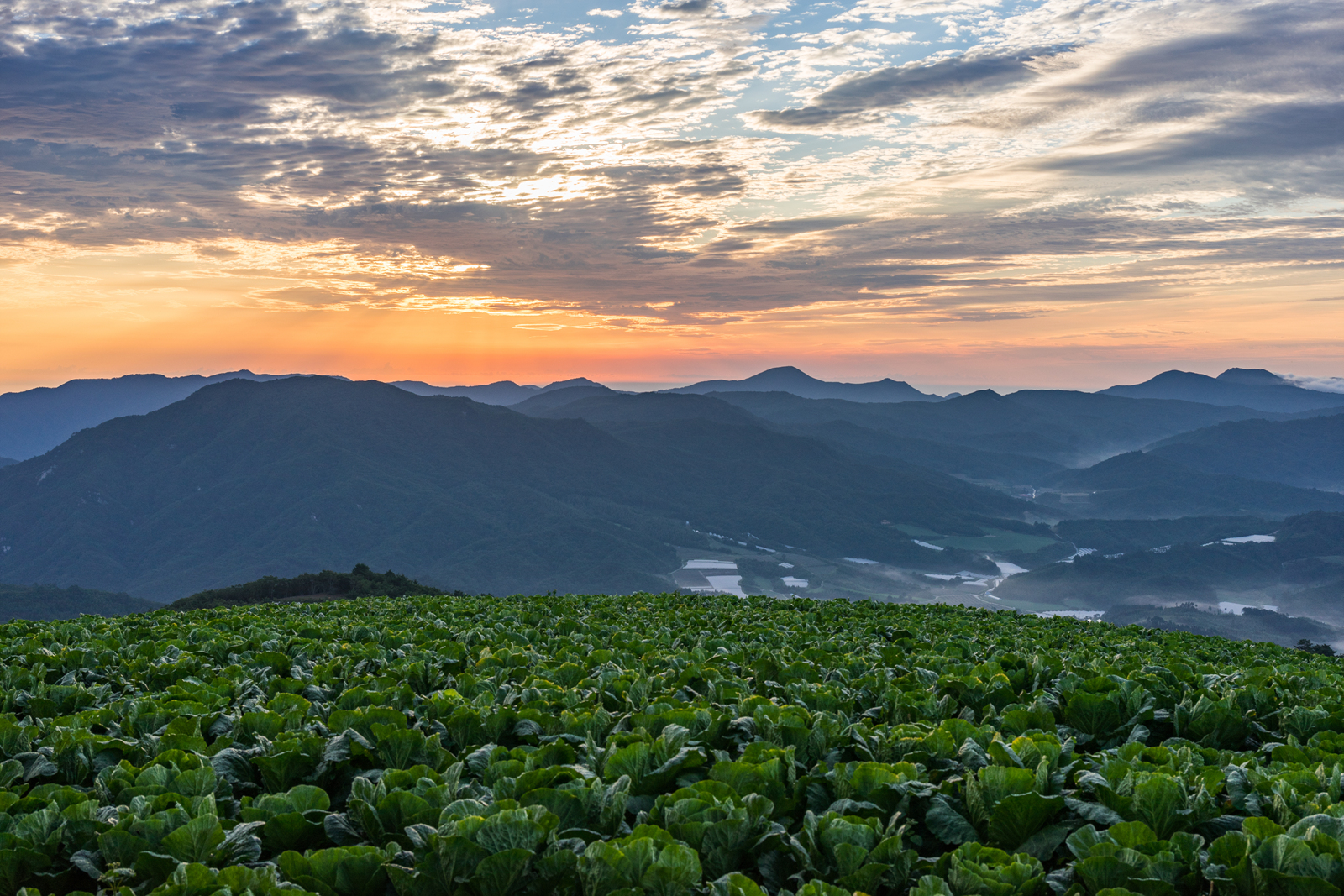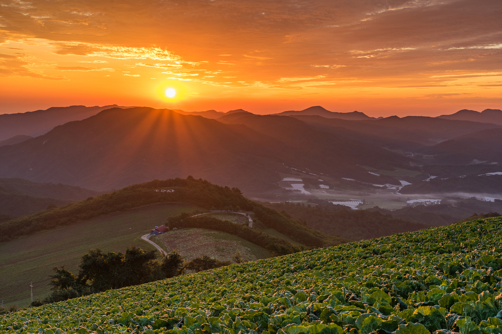 푸른빛이던 배추가 일출빛에 붉은 빛으로 물들었습니다.