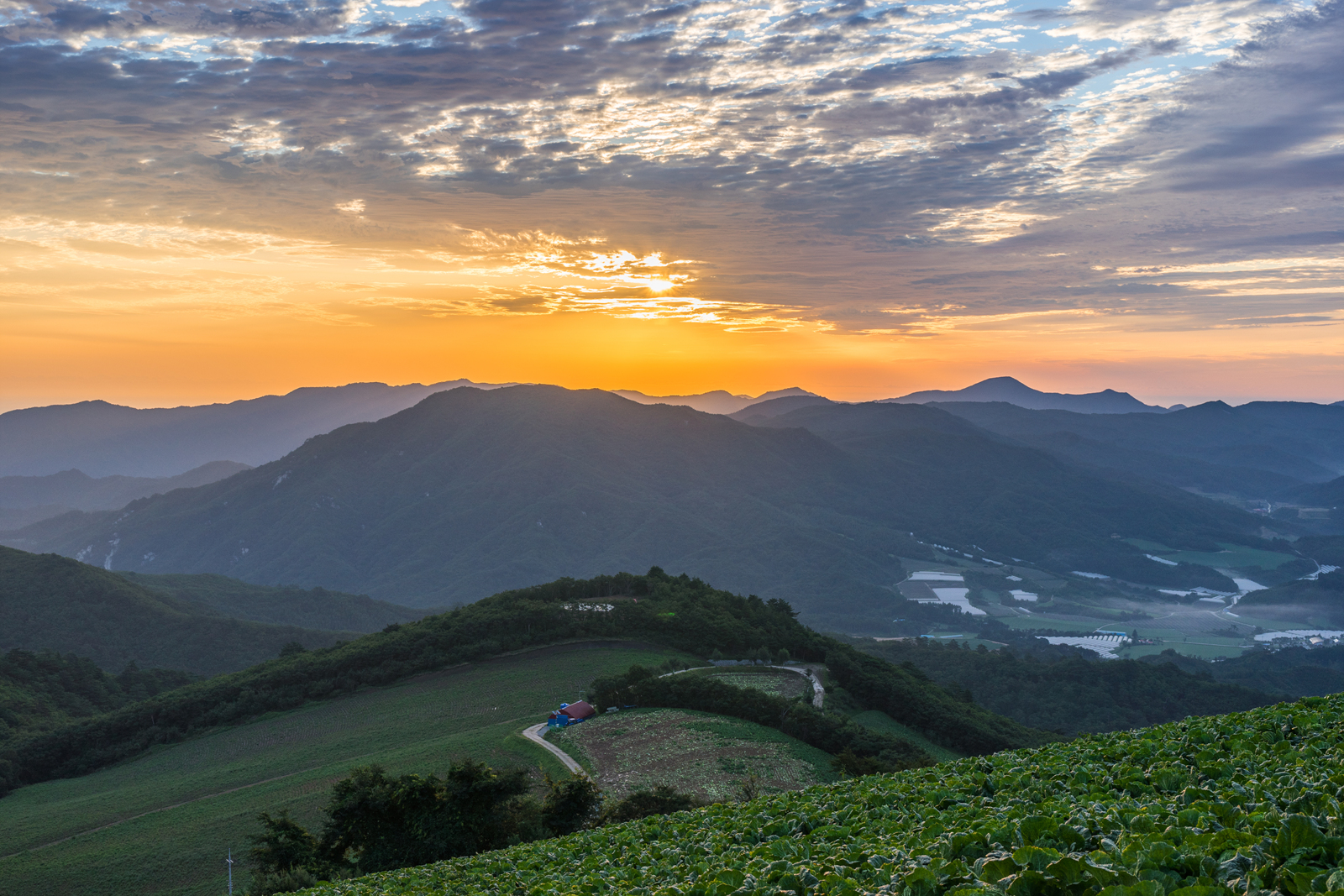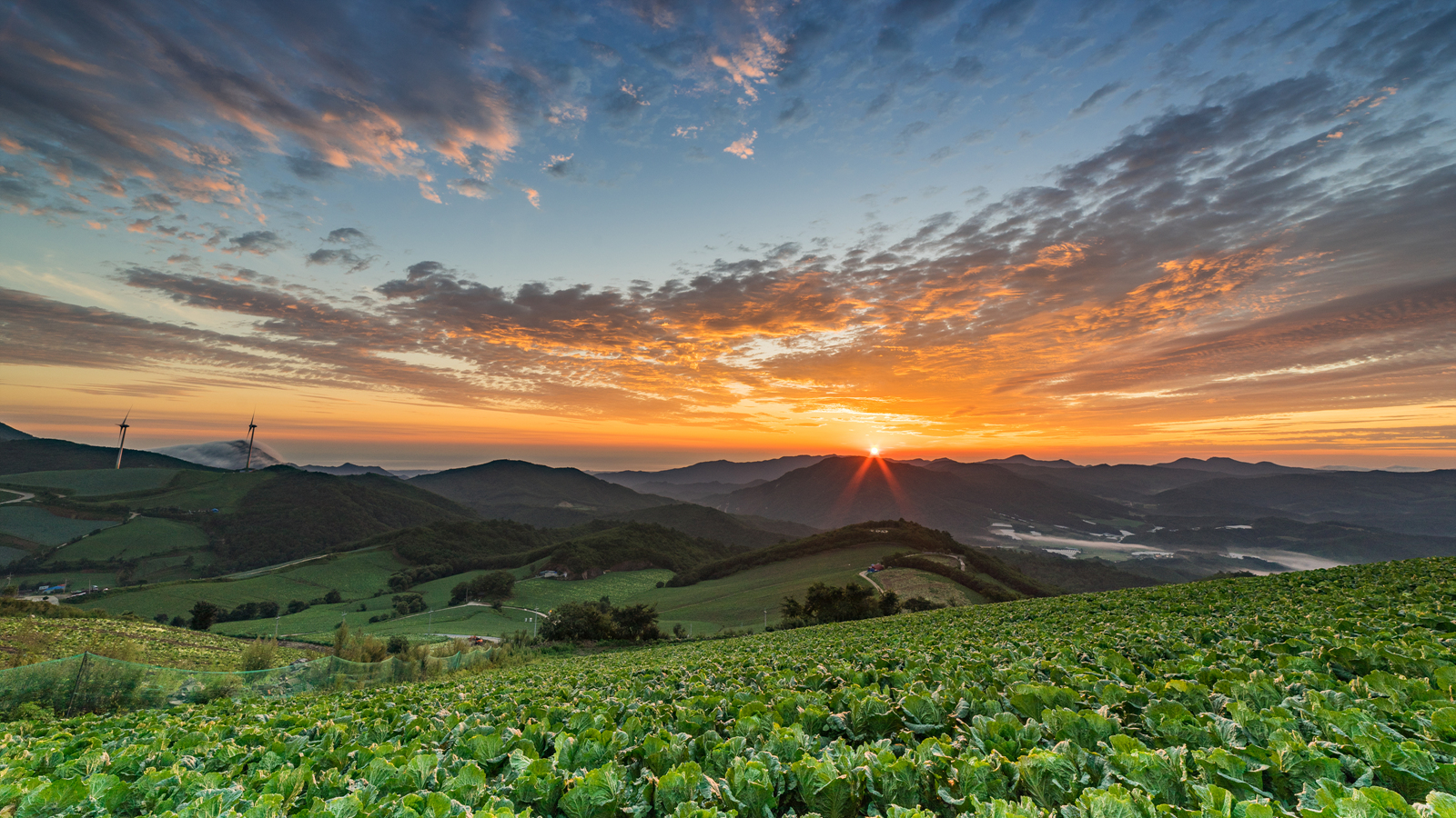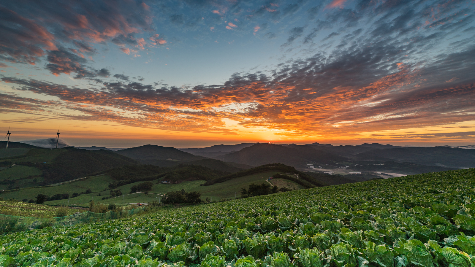 푸른빛이던 배추가 일출빛에 붉은 빛으로 물들었습니다.