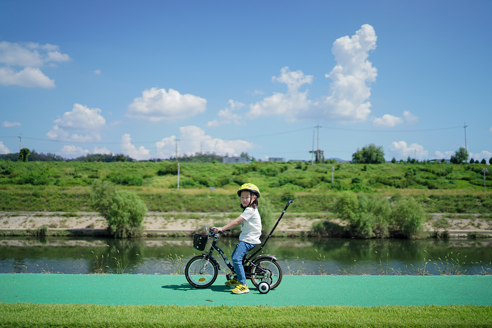 반대편에서 아이 두명을 자전거에 태워 신나게 달려가는 한 아빠를 마주하게 되었습니다.