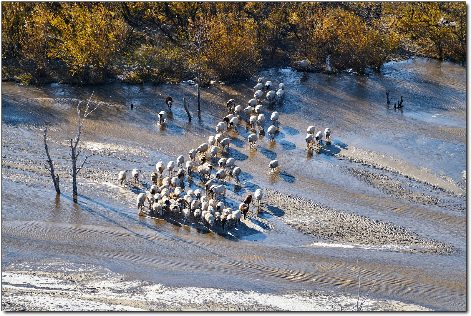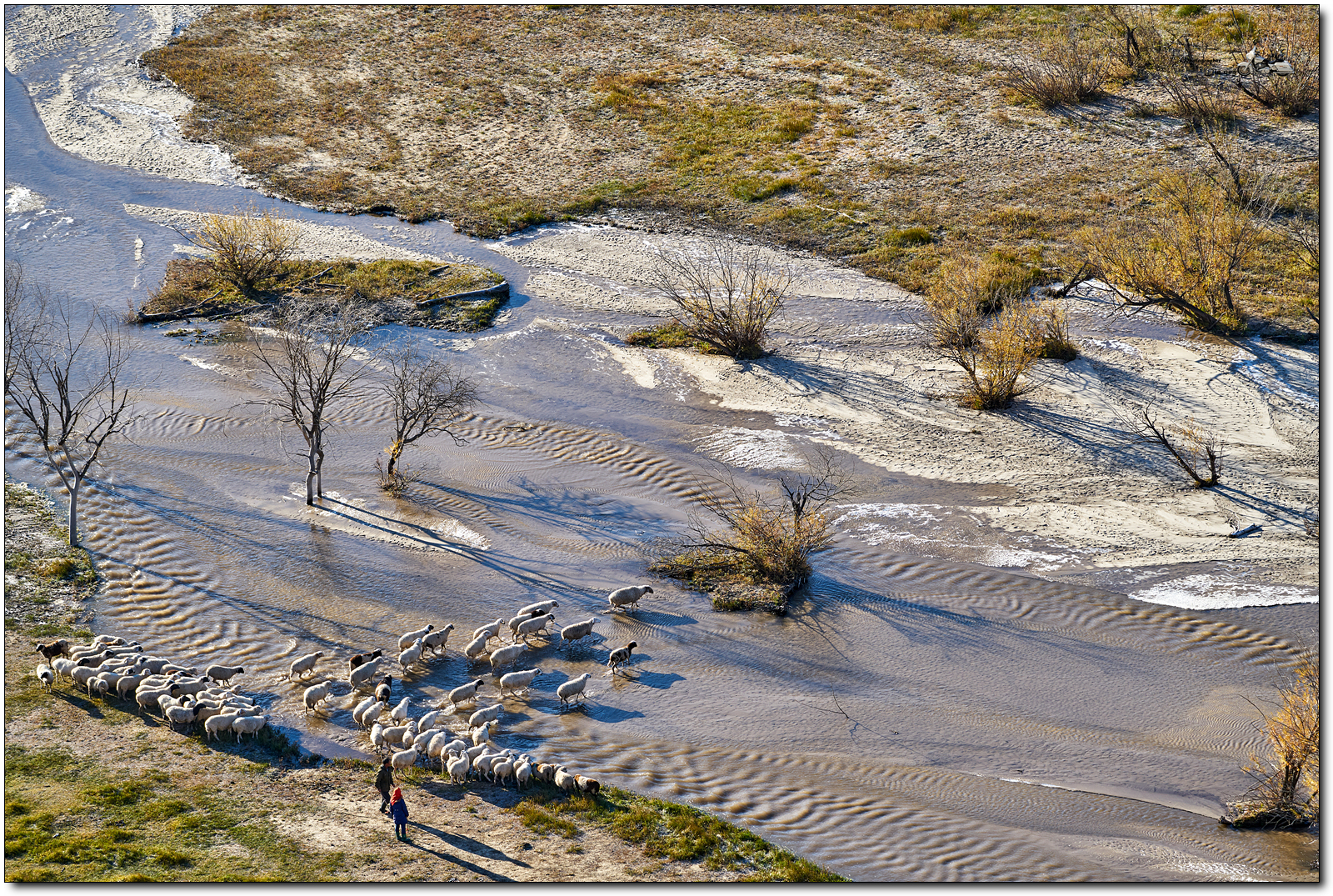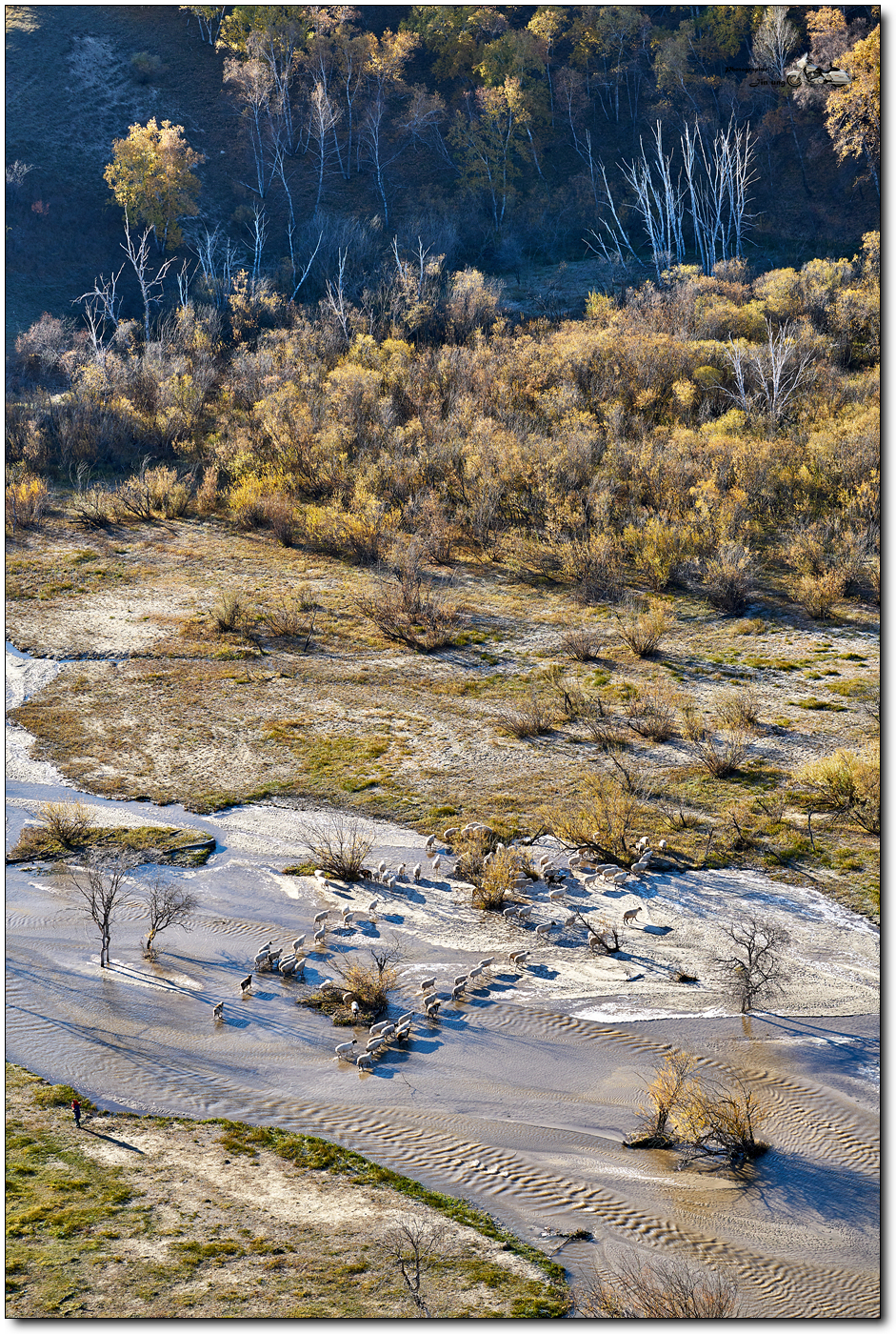 계곡 위에서, 냇물을 건너는 양떼를 찍었습니다.