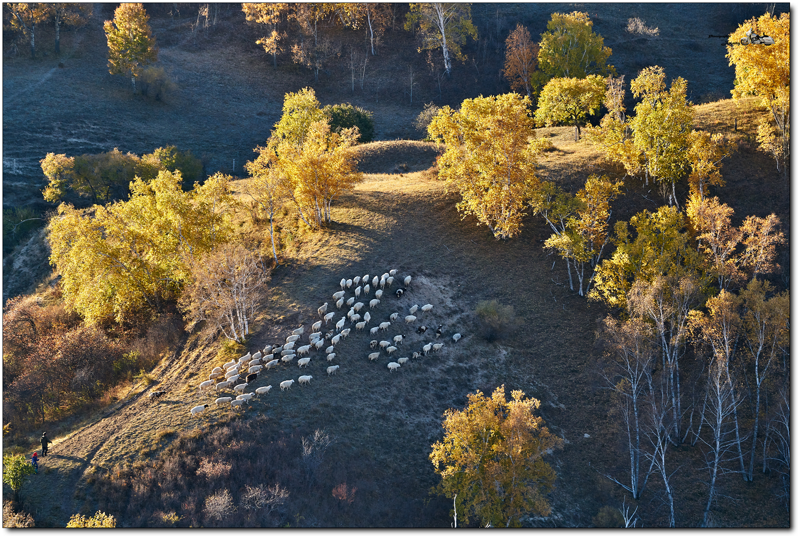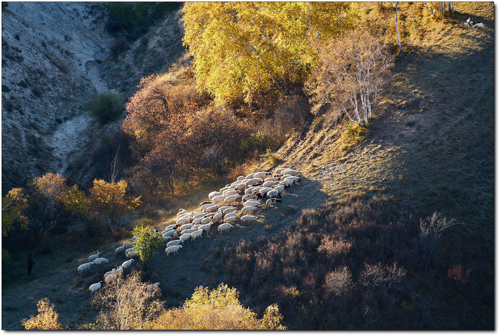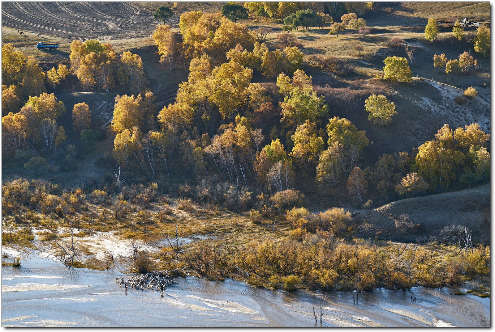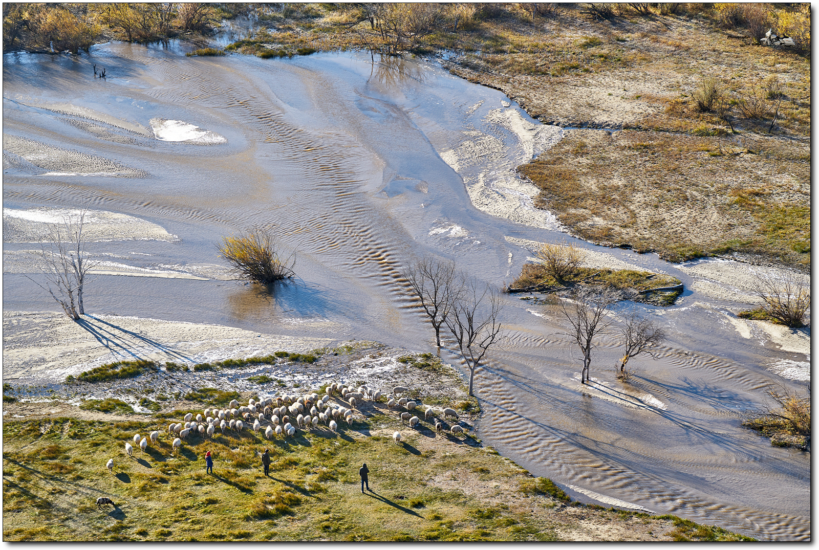 계곡 위에서, 냇물을 건너는 양떼를 찍었습니다.
