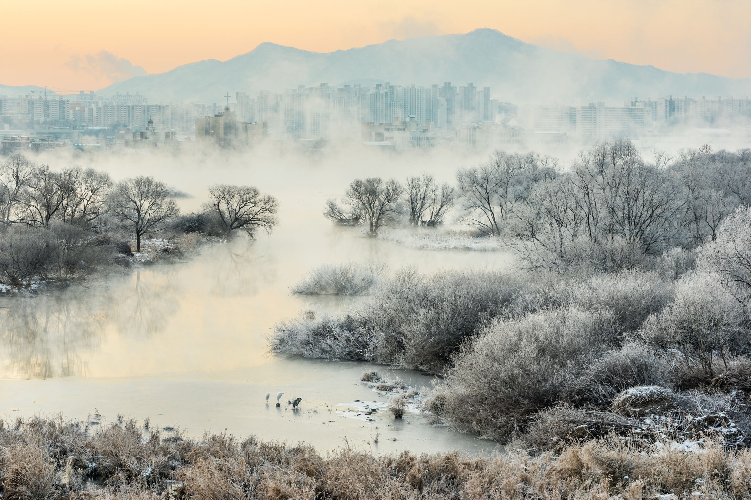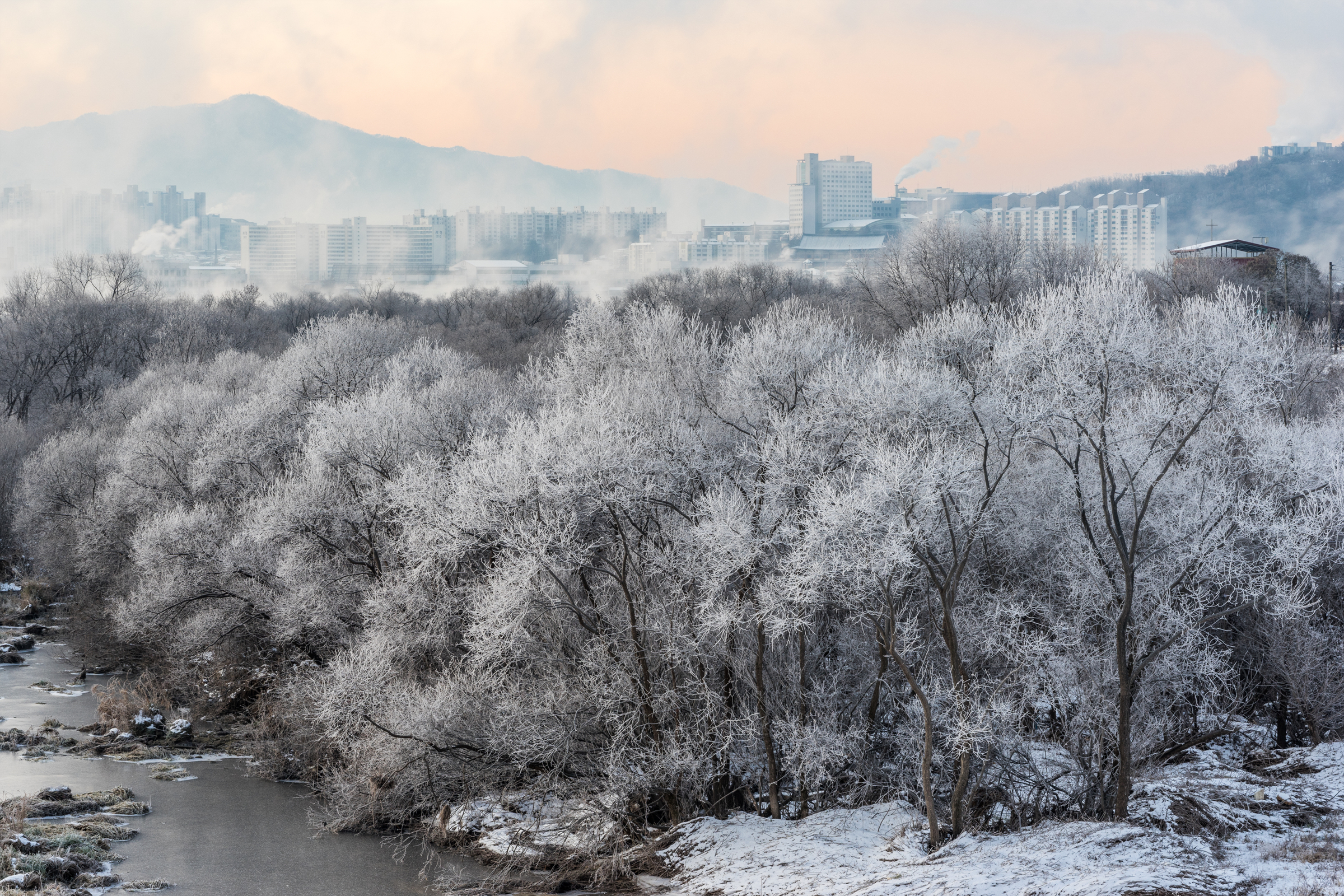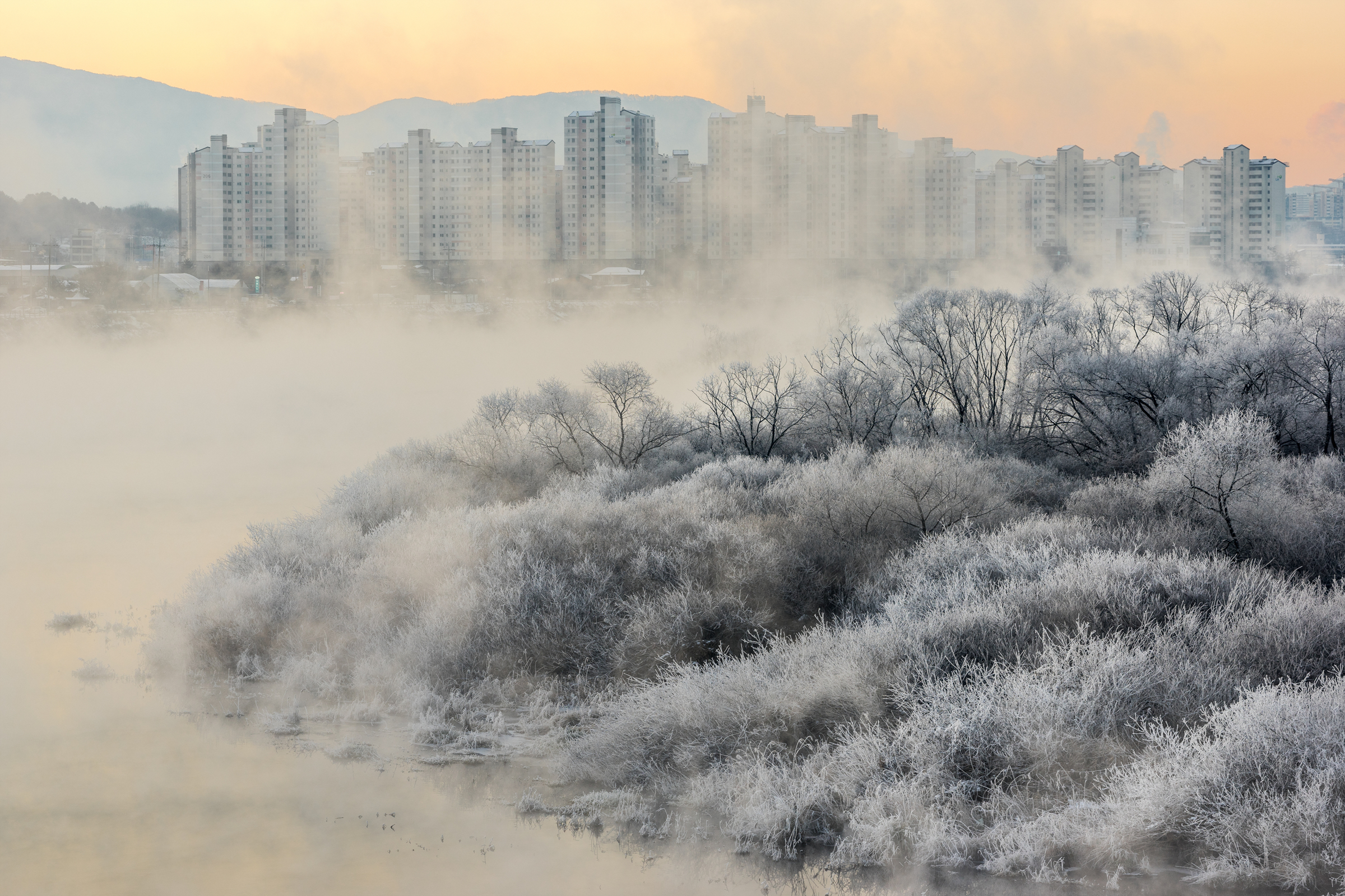 소양강에 생긴 물안개가 얼어붙어