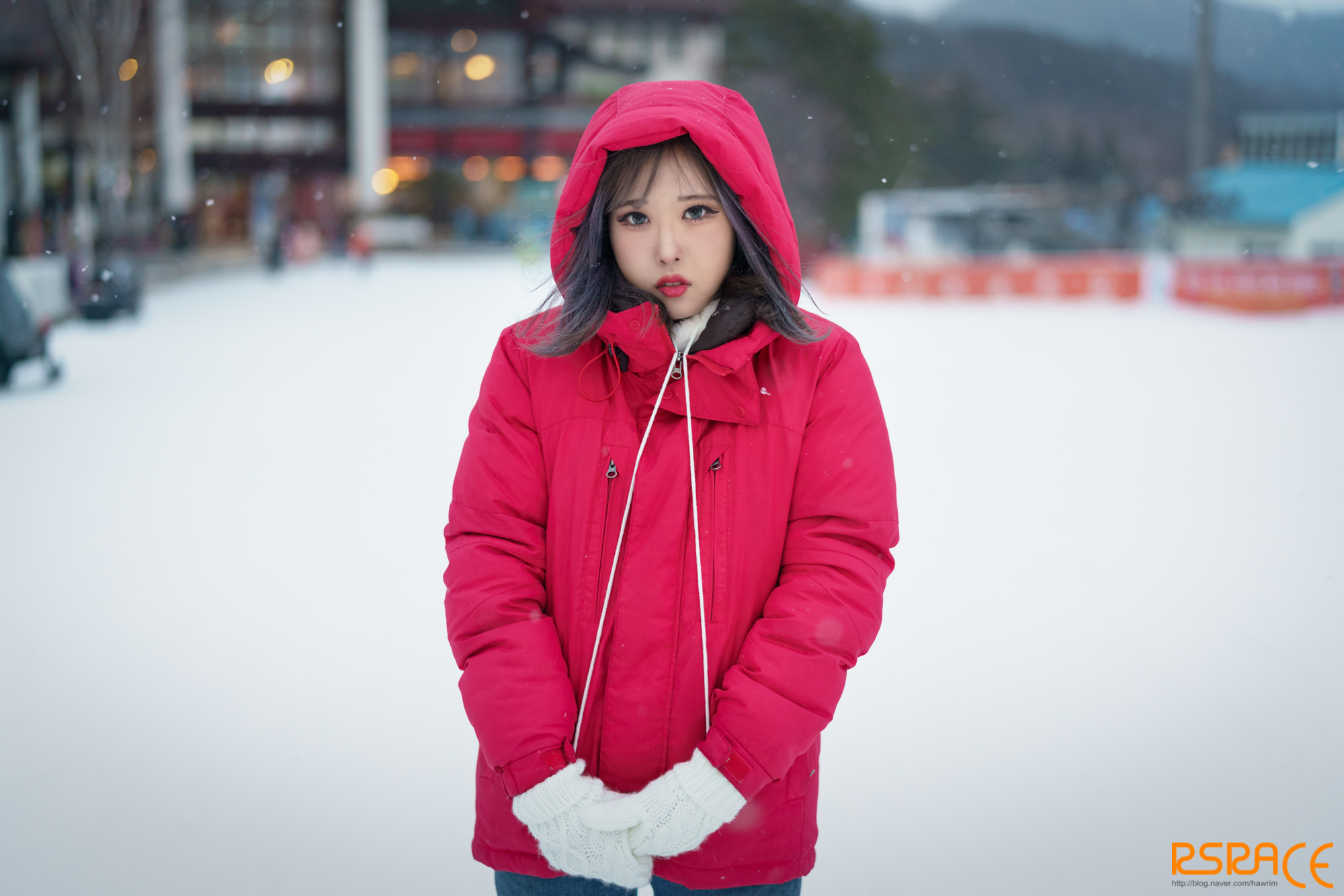 에미야 물이차다. 같은 눈빛으로 빨리 집에 가자고 말하고 있는 모델.