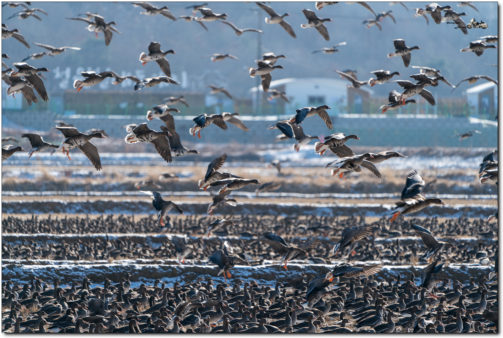 이 사진은 다음에 올리기로 하고.. 두루미 전망대를 나와 이동하던 차에 저 멀리 논바닥에 기러기 떼가 조금 보이길래