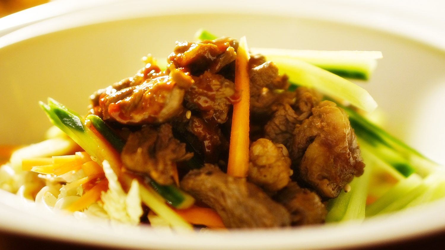 밑간을 하고 살짝 익힌 국거리용 쇠고기, 오이, 배추, 당근, 그리고 초고추장.
