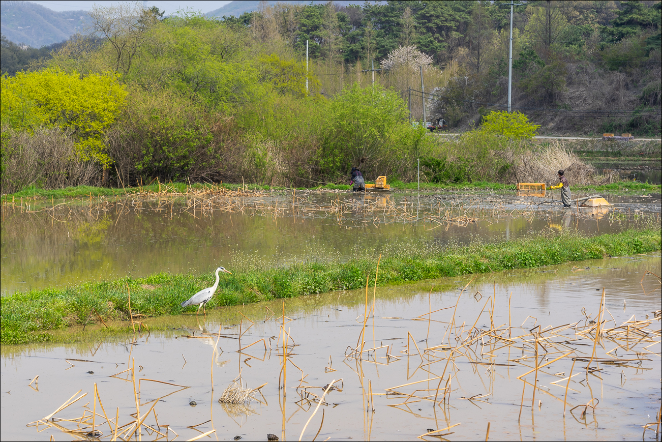 안성 고삼저수지에서  연꽃 농사로 분주하는 분들과  왜가리, 쇠백로의  유유자적한 먹이활동을 바라보면서