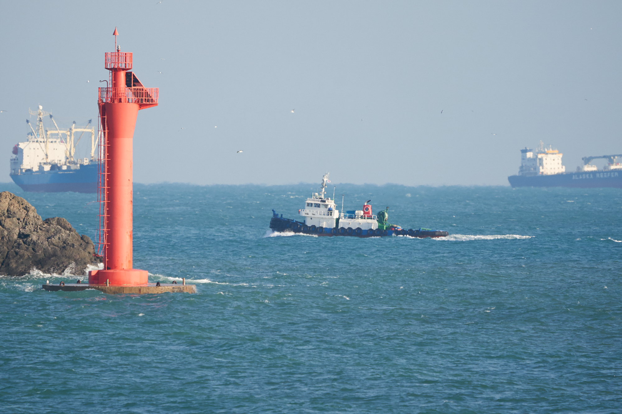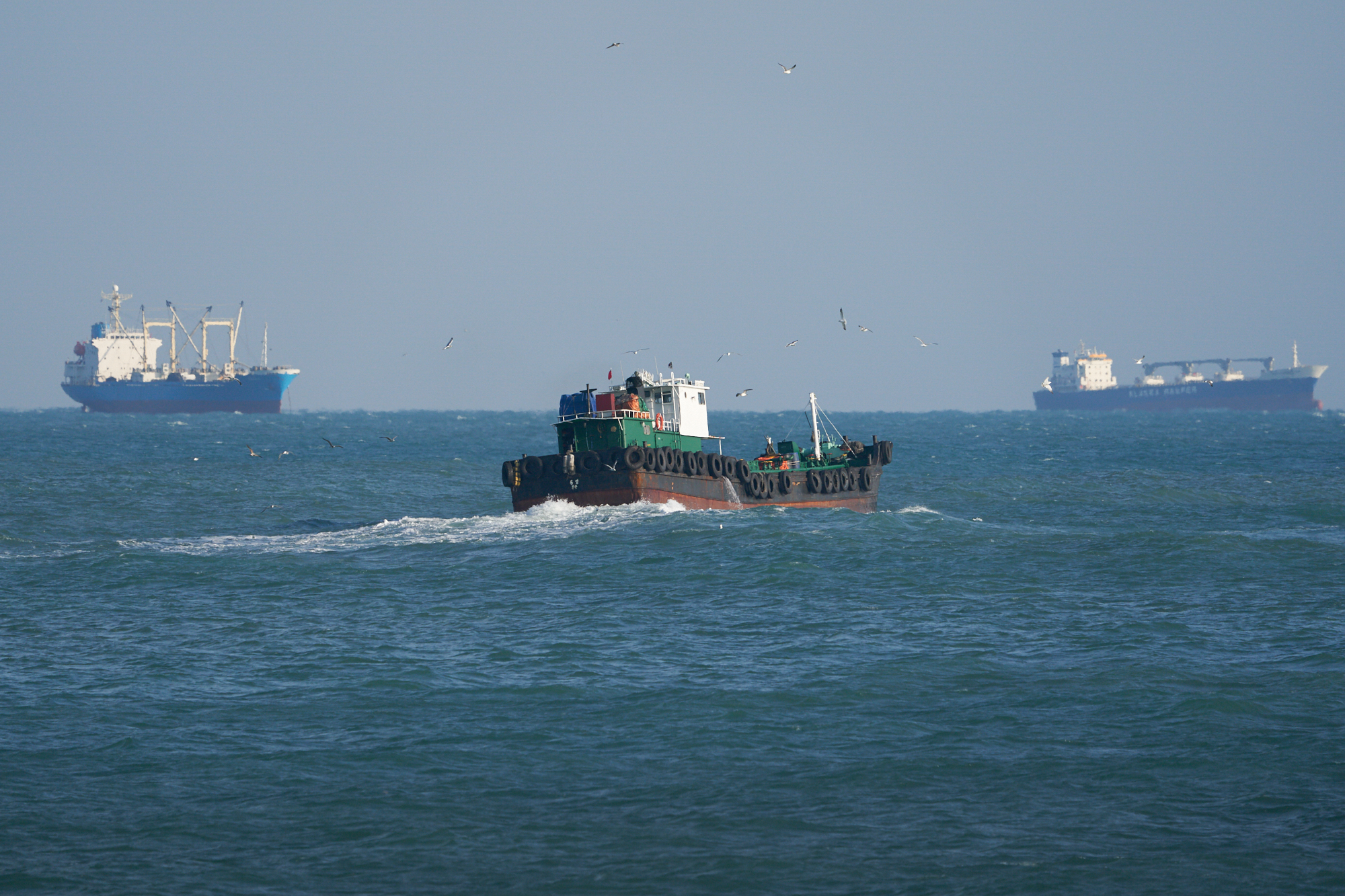 항구에서 빈배로 나가는 어선 같은데 갈매기들이 따라 붙네요.