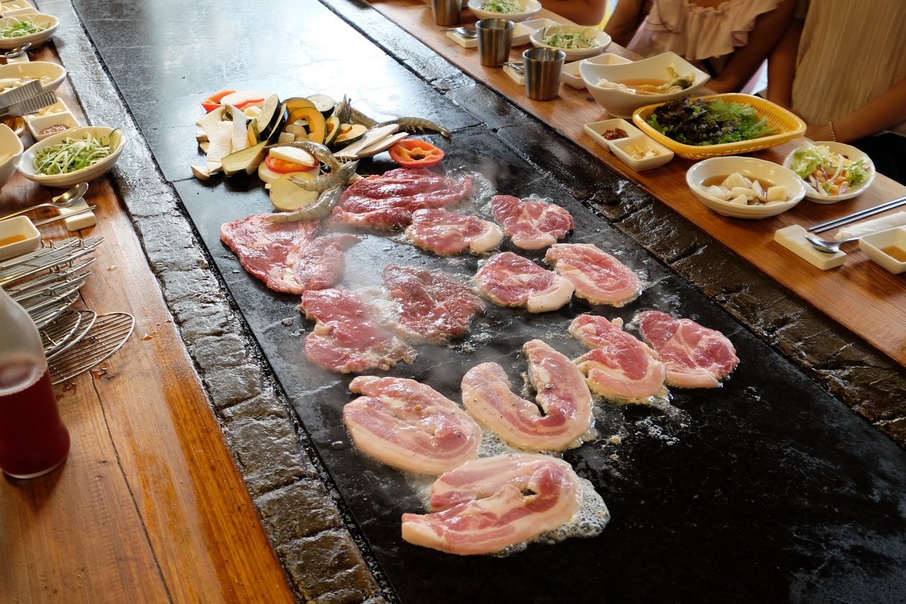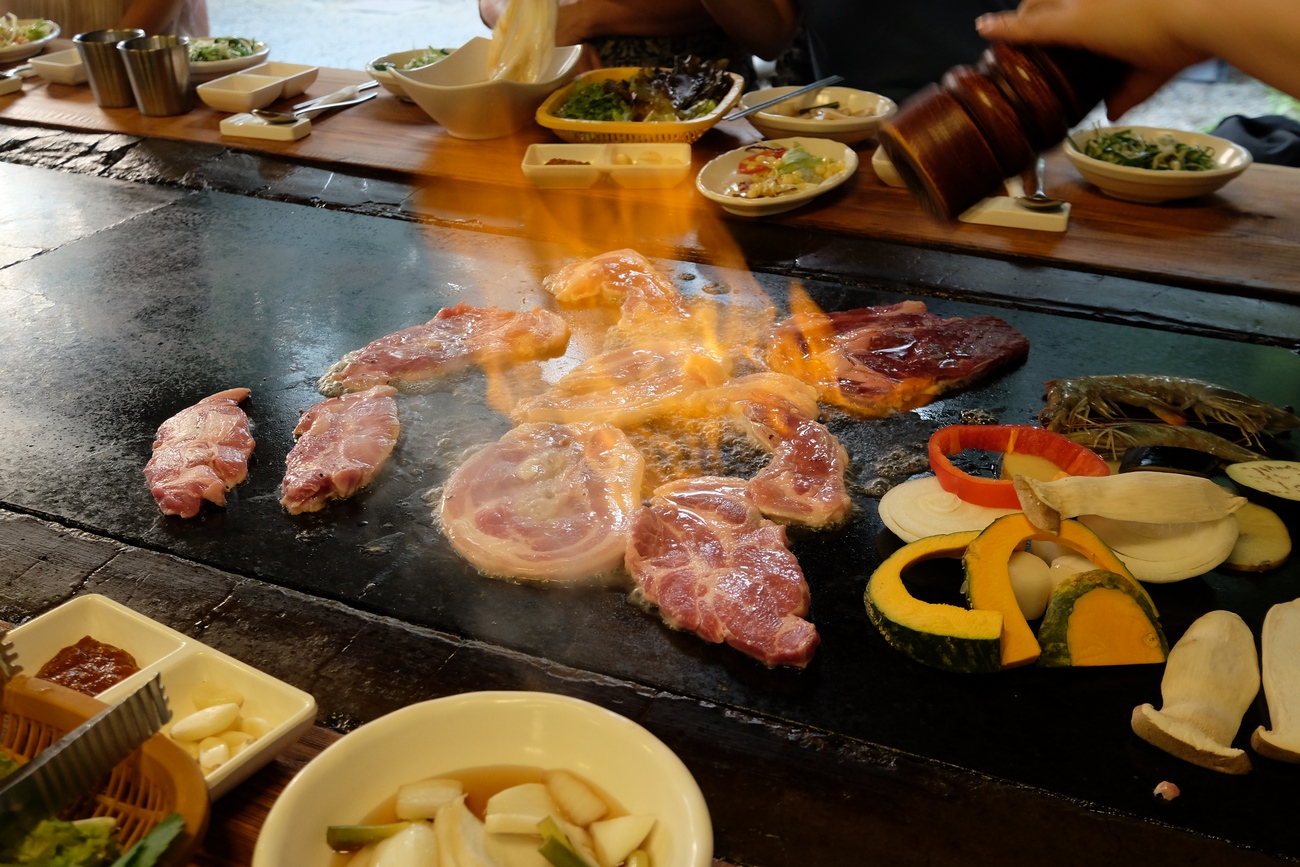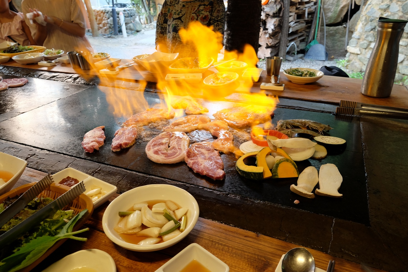 아궁이에 장작불을 팍팍 떼면서 돌판에 고기를 구워줍니다. 이건 찜질방인지 고기집인지 ㅋㅋㅋㅋㅋ