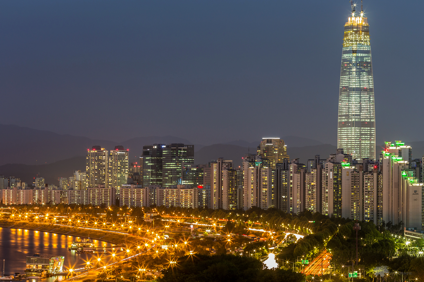 청담배수지 공원에서 바라본 롯데타워입니다. 가로 등불이 별천지 처럼 보이네요...^^;;; 굿밤되세요~~