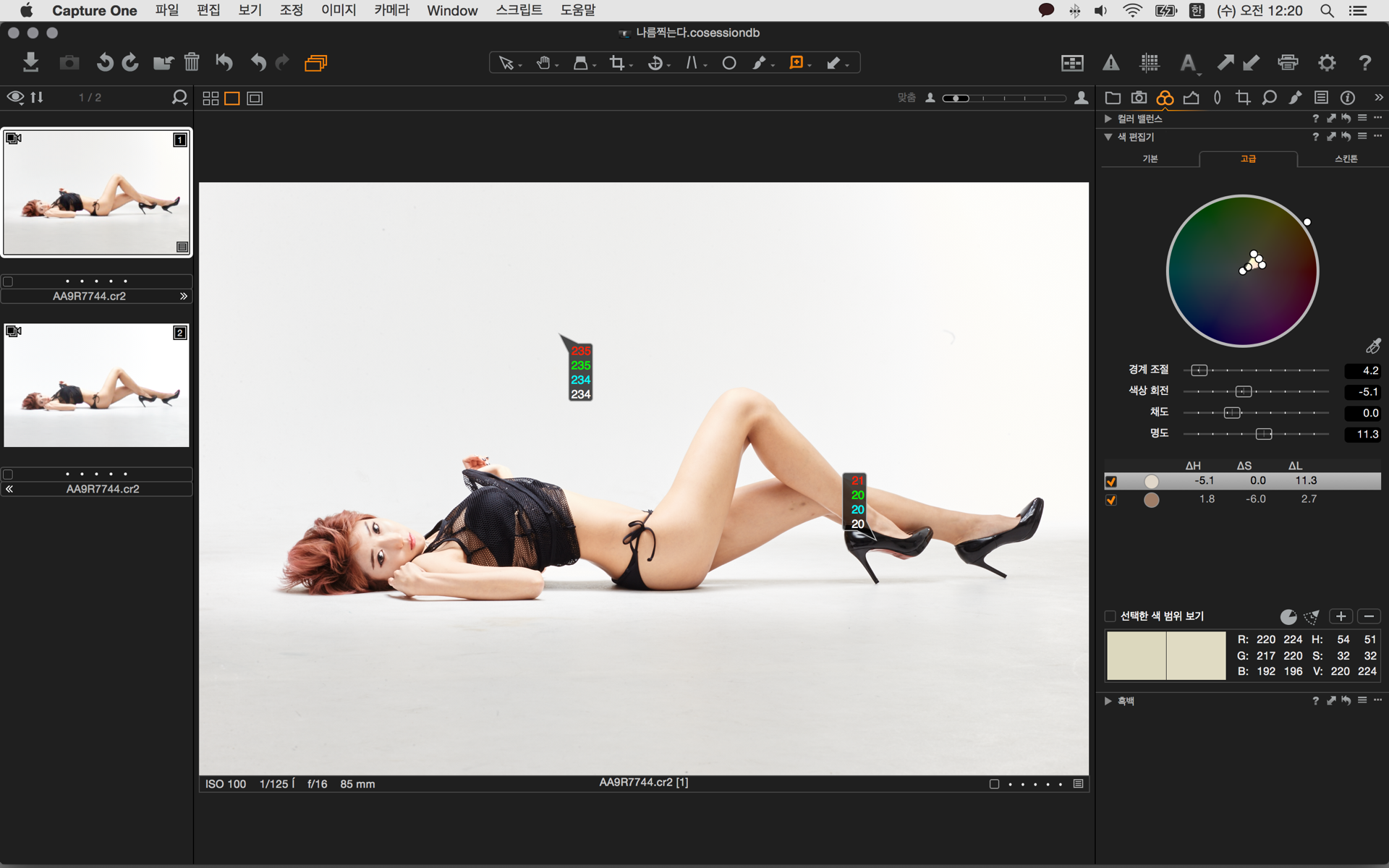 라이트룸의 경우 색을 선택하여 바꿀수는 있지만
