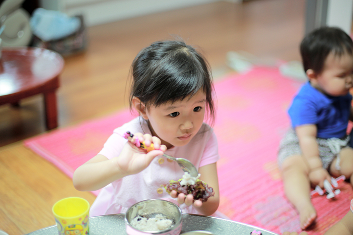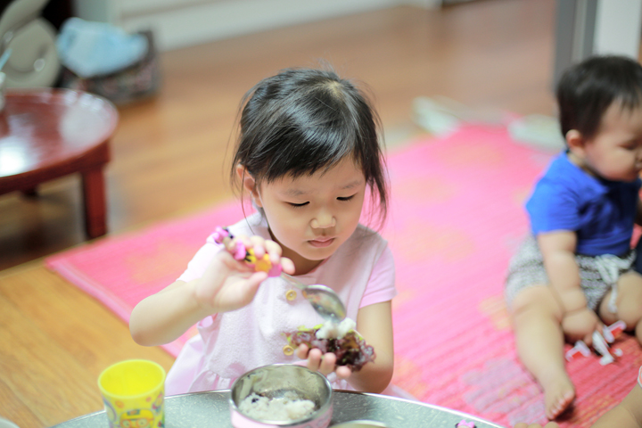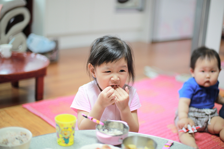 다섯살 딸래미가 상추에 밥 올리고 고기 넣어서 한 그릇을 뚝딱하네요 ㄷㄷㄷ