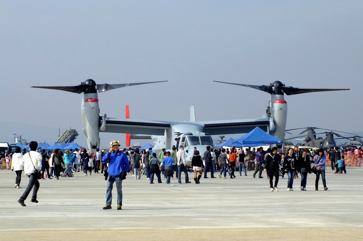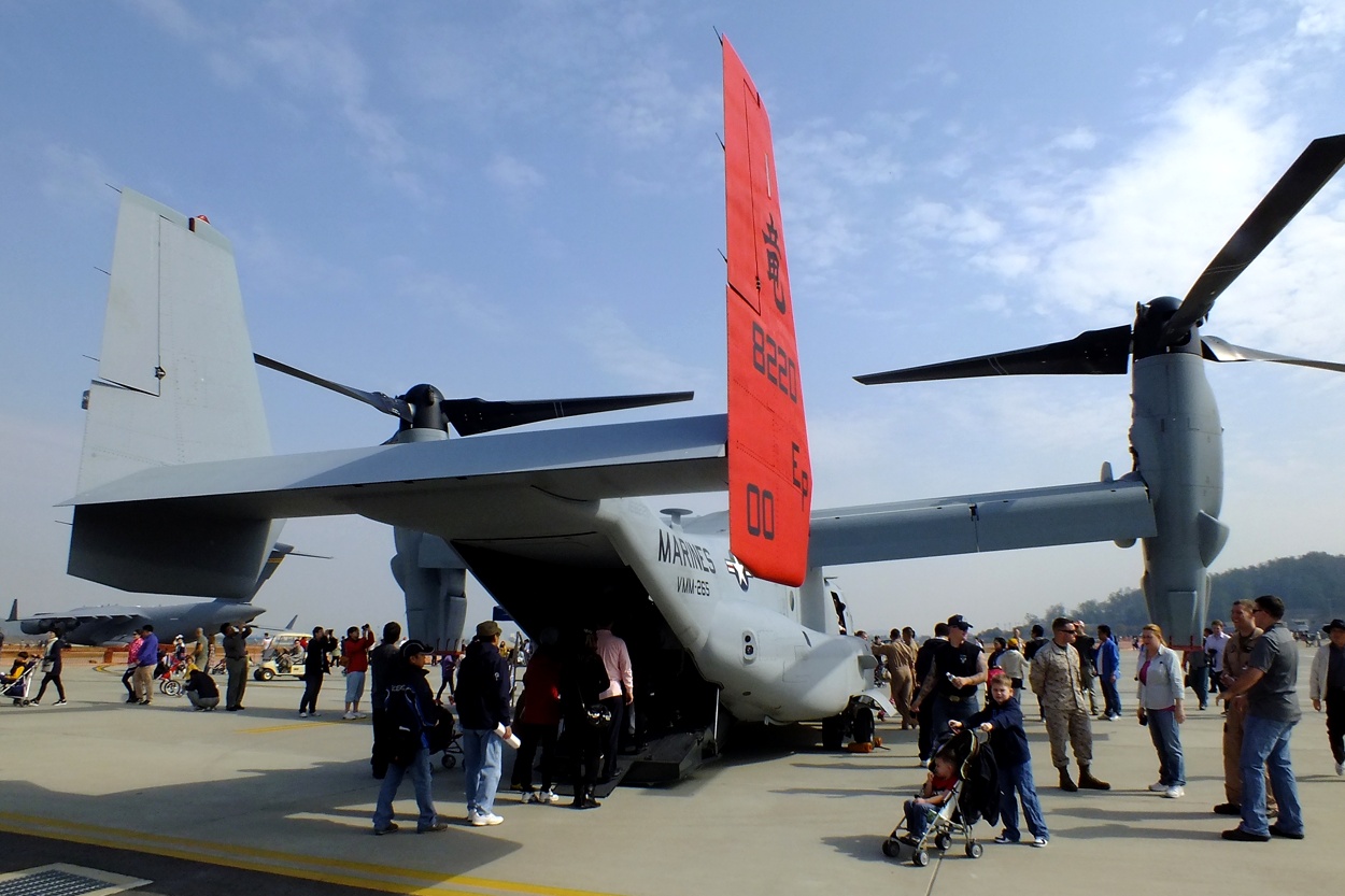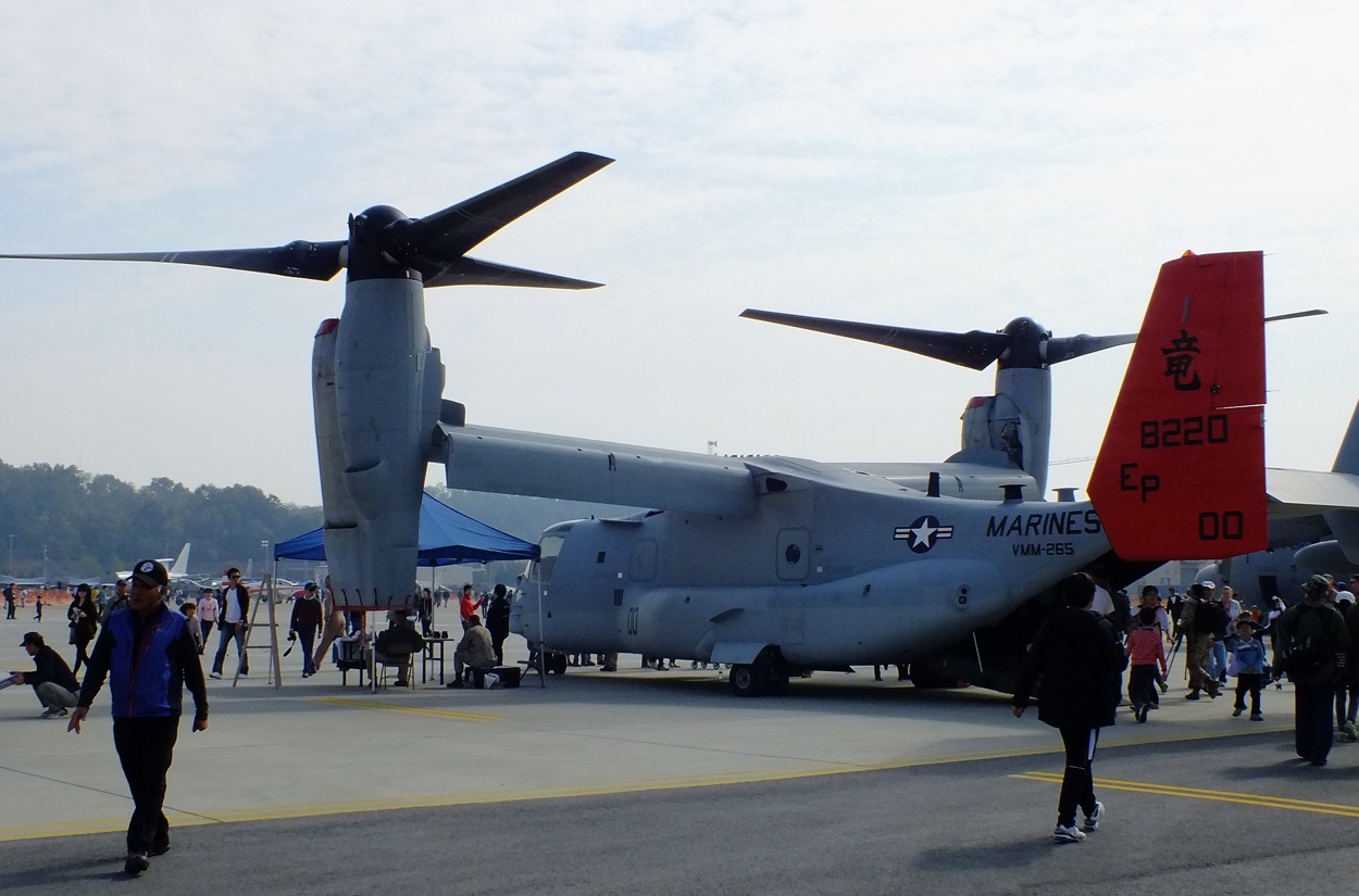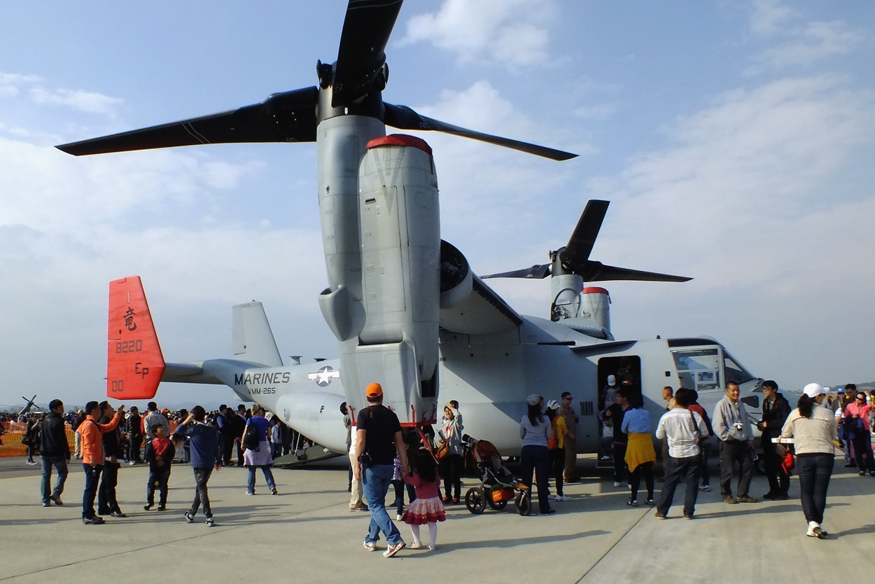 주일 미해병대가 보유하고 있는 신형 수직이착륙 수송기 MV-22 오스프리(Osprey)와..