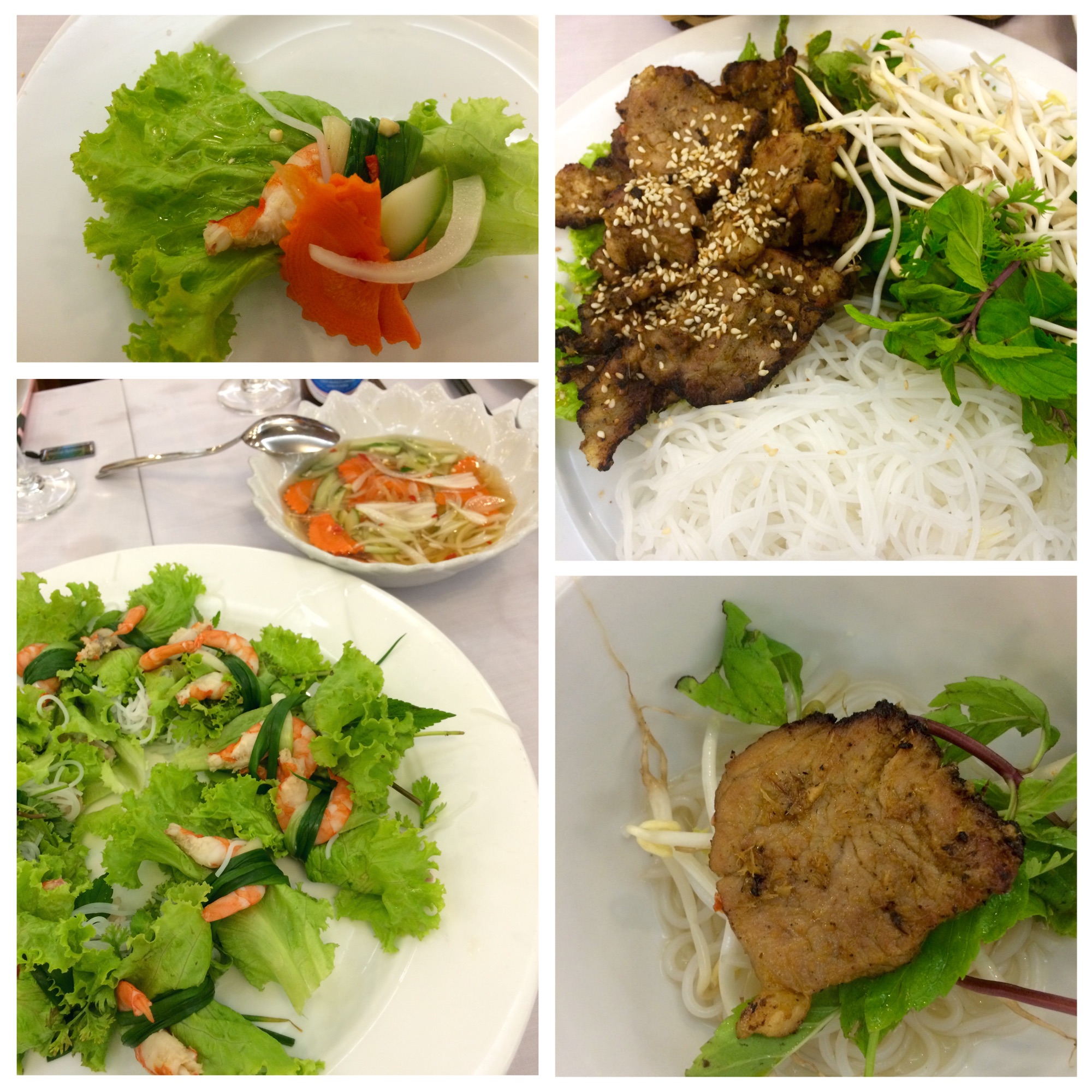 새우와 고기, 샹차이, 쌀국수를 상추에 말아놓은 뭔 샐러드와