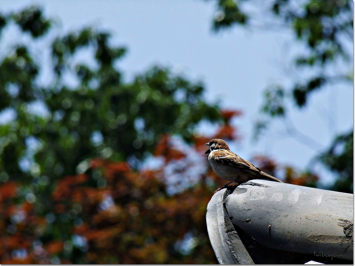 한옥의 담장끝에 앉아있는 참새를 발견하고