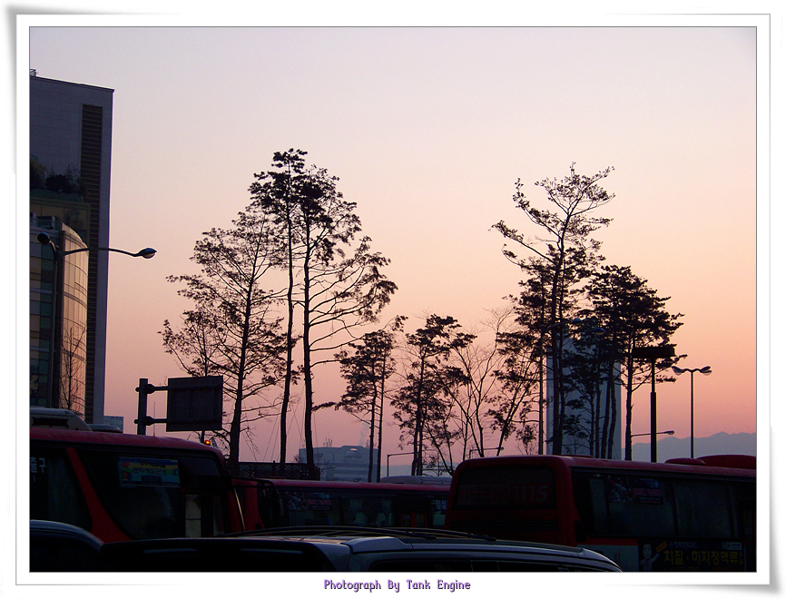 노을에 물든 가지만 앙상한 나무 도심의 추위는