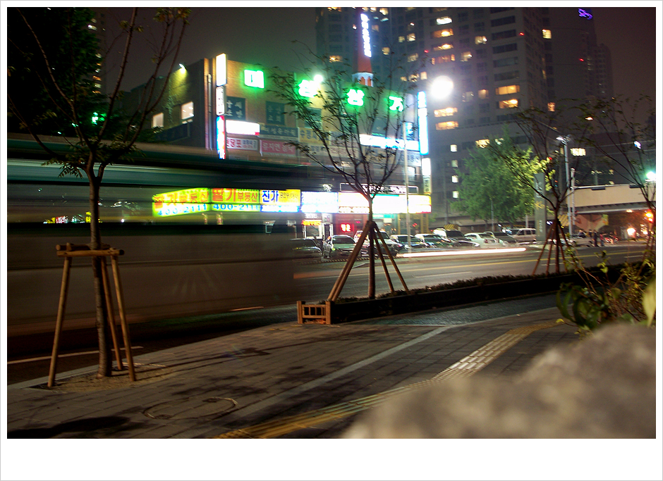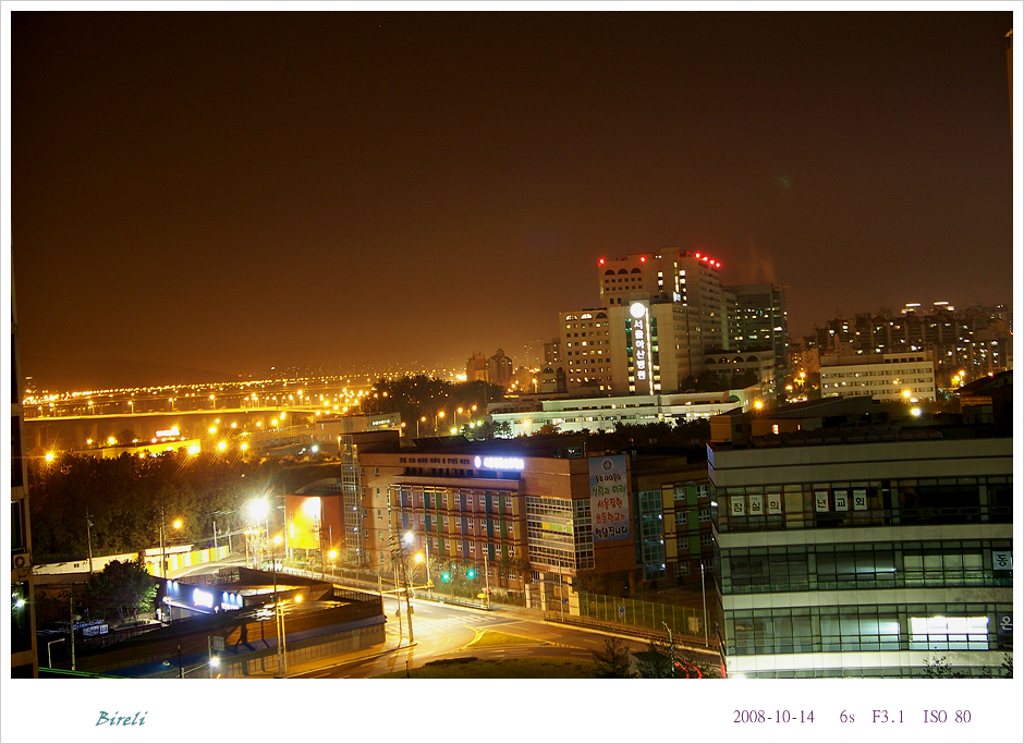 야경 찍을 여건이 안 돼서 이것저것 찍어 봤습니다. 아마도 앞의 두 사진은 밤 1시쯤 아파트 14층인가 올라가서 남의 현관 앞에서 몰래 찍은 것 같습니다. 그러다가 그 집 주인이 밤 늦게 귀가하면서 절 보고 매우 의심스러운 눈초리로 '누구요?' 하는 바람에 우물쭈물하던 민망한 기억이...