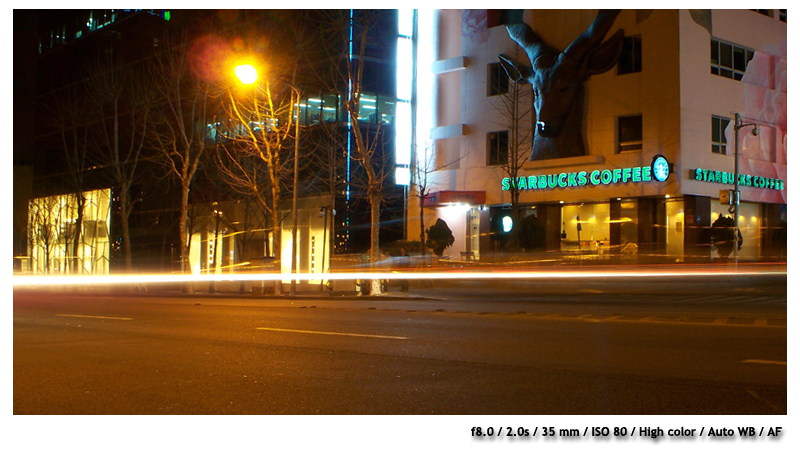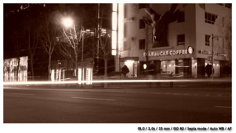 11시쯤...카메라를 가지고 동네 한바퀴 돌아보았습니다.. 어두운 환경이고, 삼각대가 없어 구도가 제한적입니다.. 벤치에 올려 놓고 여러가지 program mode와 노출로 촬영해 보았습니다... 노출이 0.0 일때는 너무 밝게 나와 , 대략 -2.0 정도로 하였습니다..( M mode 시 노출값은 기록이 되지 않아 대략적인 기억입니다...) Sepia mode가 은근한 매력이 있는 듯합니다..