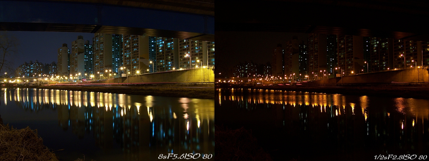 SCN에서는 1/2초 정도의 셔터속도가 나오기때문에 약간은 야경에서 어두운감이 있습니다.