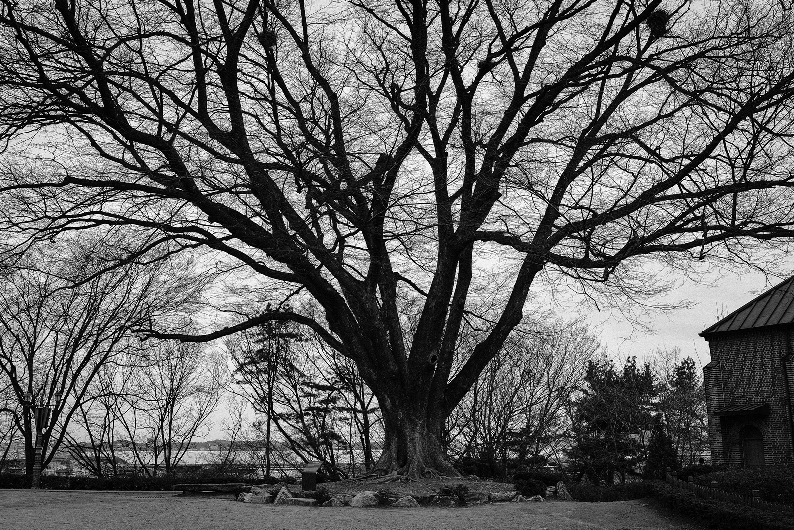 벚꽂 다 떨어질 무렵에 가서 그런지 아주 큰 보호수에 잎이 다 떨어지고 없더군요 안그래도 날씨가 좀 어두웠는데 보호수의 으시시한 분위기가 인상적이라 찍어봤습니다