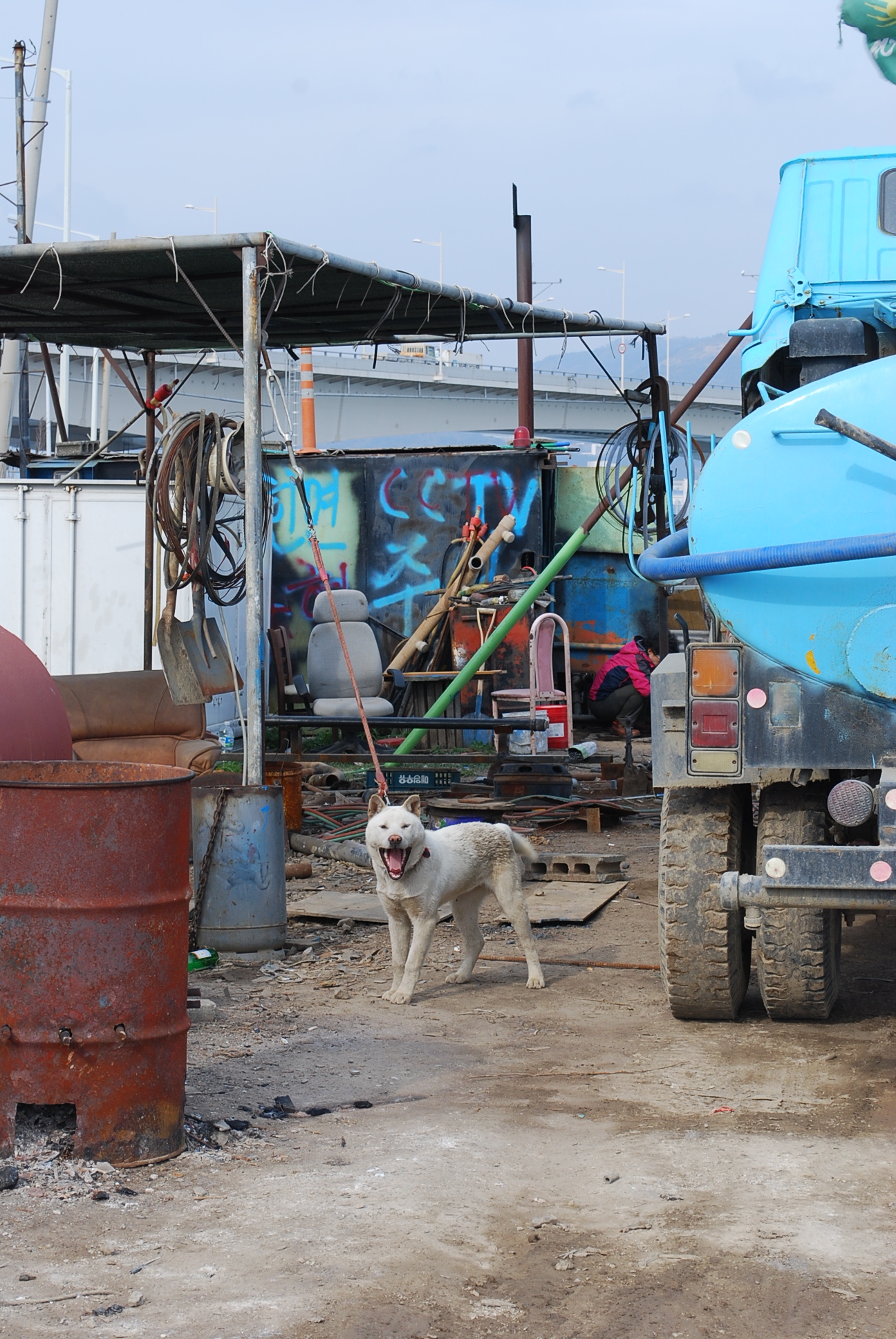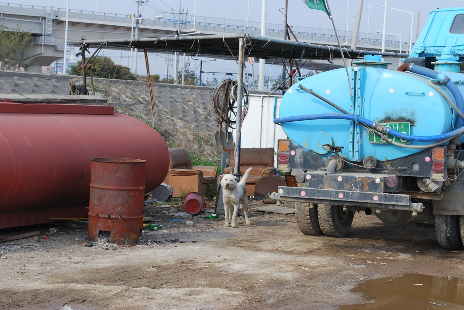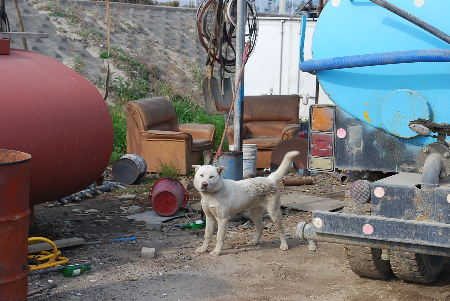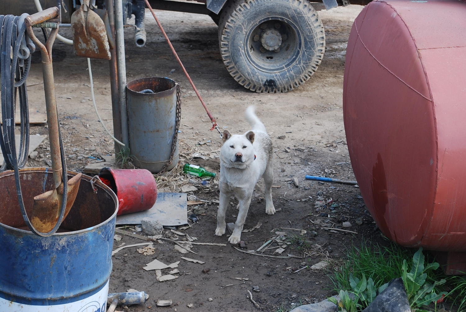 줄을 너무 짧게 묶어놓아서 앉지도 못하고 계속 서 있어야하는 개를 보고 불쌍해서 찍었던 기억이 나네요..