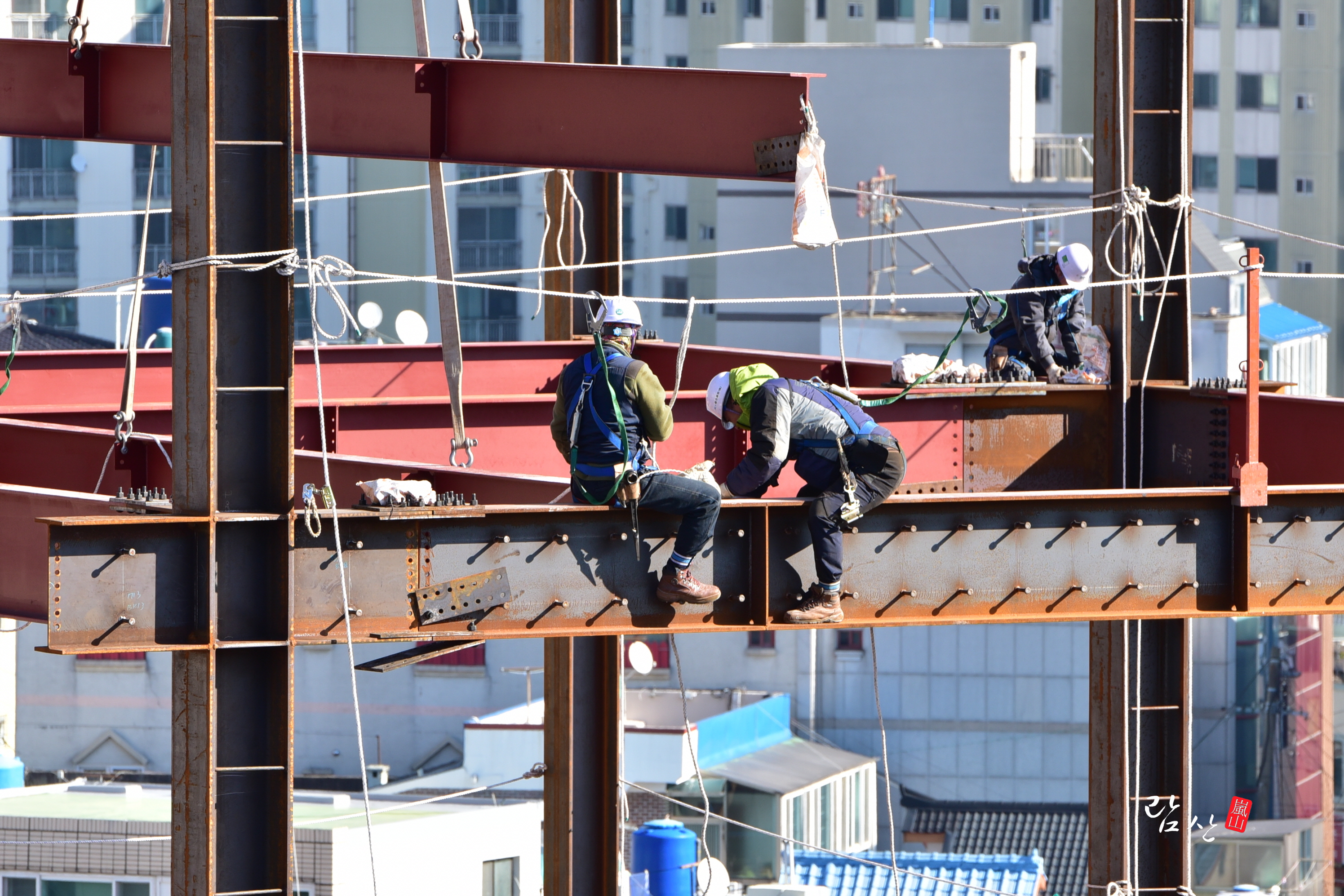 영하의 날씨인데도 고소(높은곳의 작업장)에서 작업하는 사람들