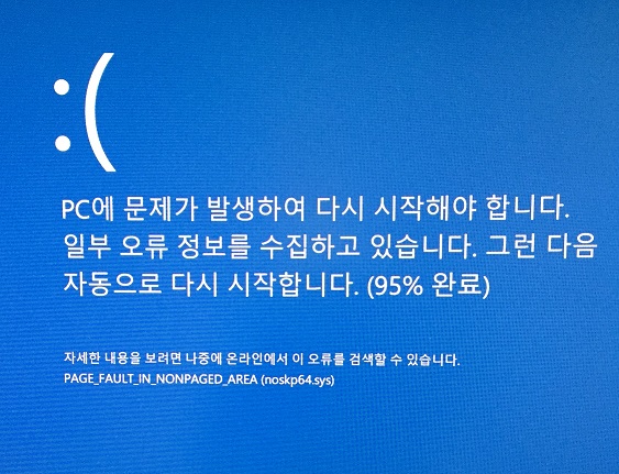 이번에는 로그인후에, 파란색 화면이 뜹니다. 메시지에 어느 파일에 문제가 있다고 떠서