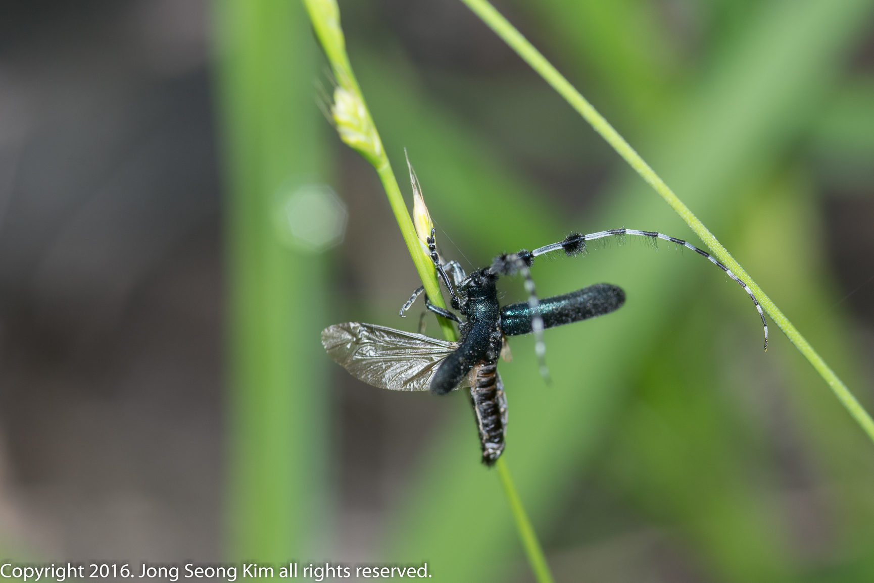 남색초원하늘소가 날기 직전에 날개를 편 모습입니다.