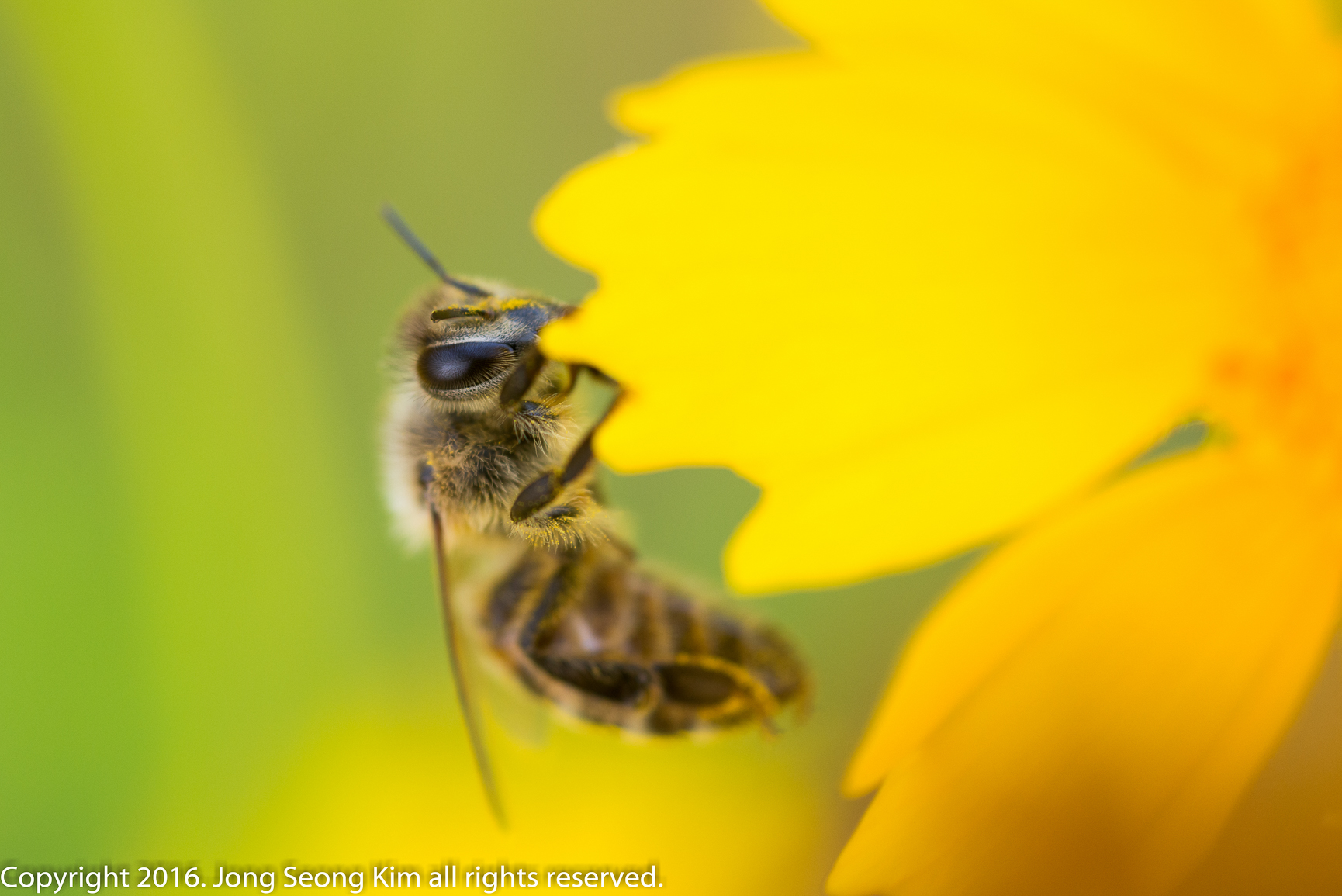 꿀벌 한마리가 날아가다 거미줄에 걸려서 바둥거리고 있을때 거미가 다가옵니다.