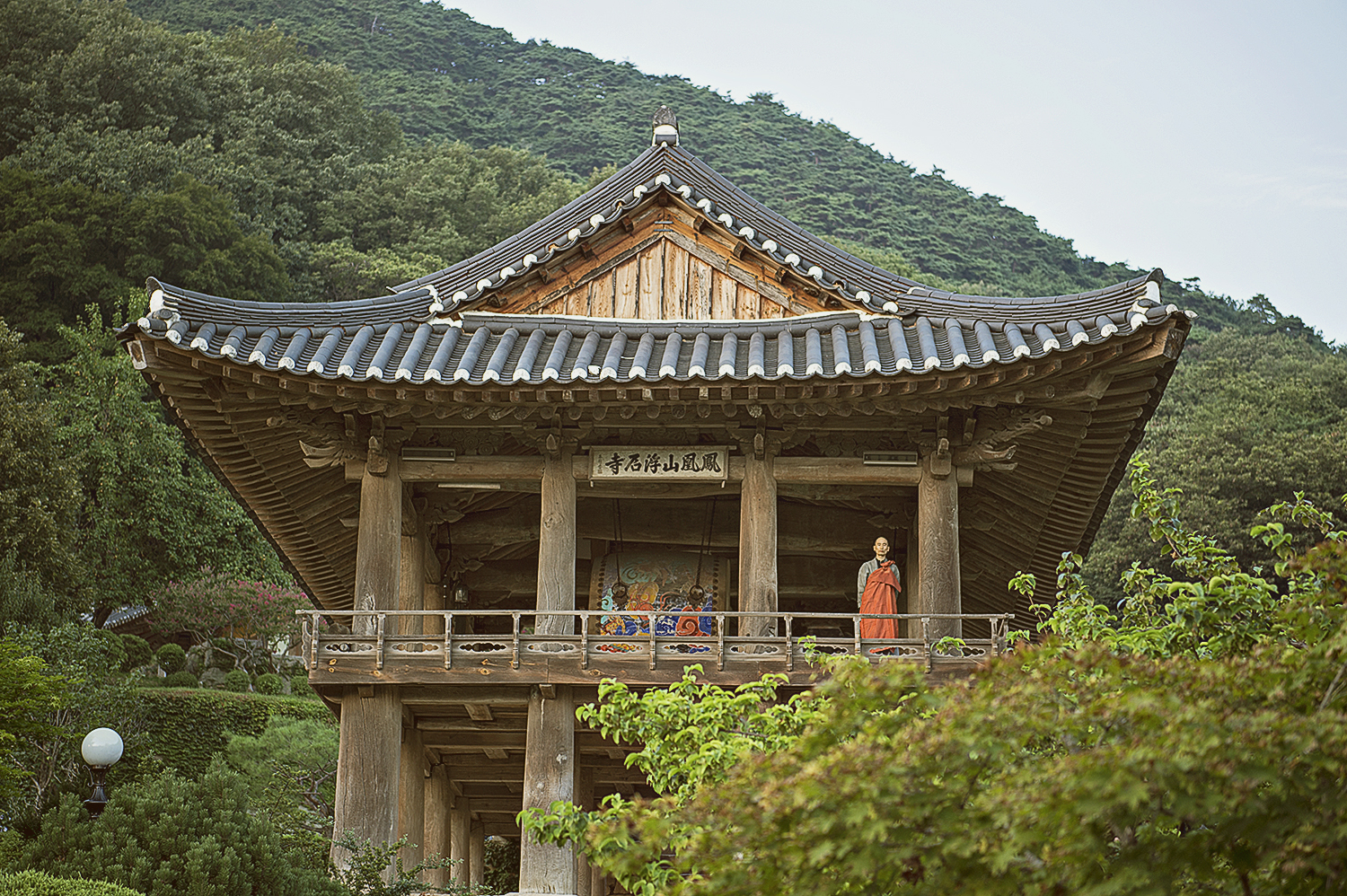 저녁 예불 전 범종각 위에서 두분의 스님이 번갈아 가면서