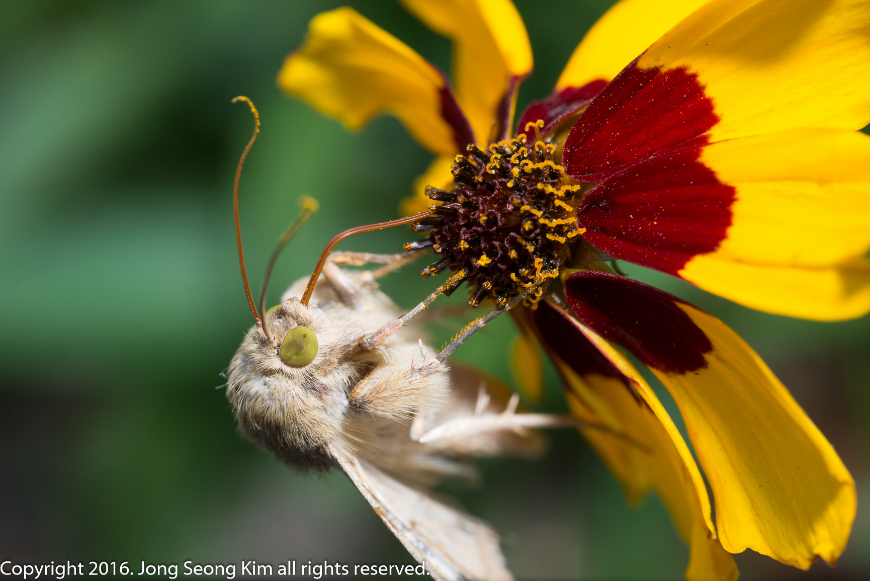 나방의 한 종류 같은 녀석이 철 늦은 기생초에서 꿀을 빱니다.