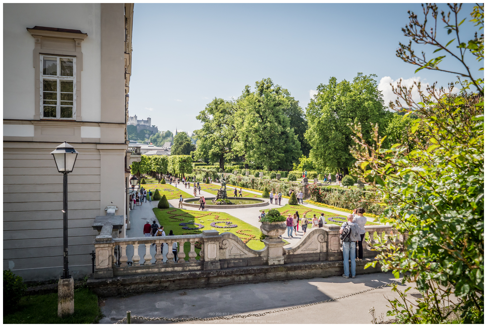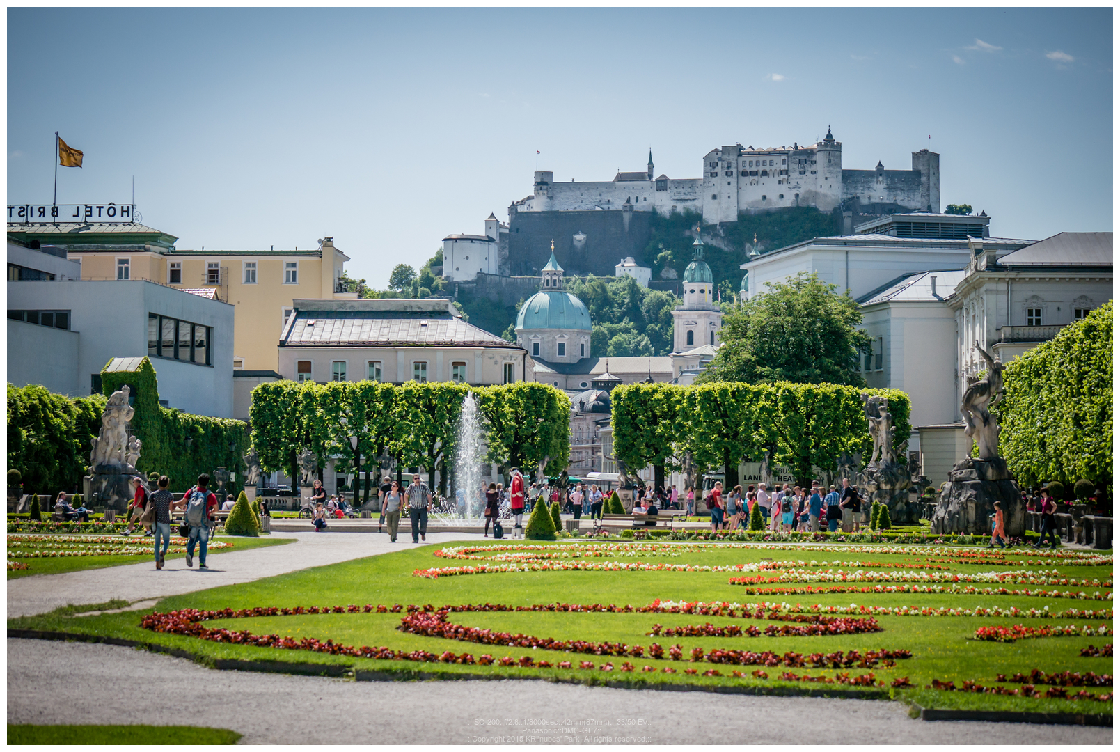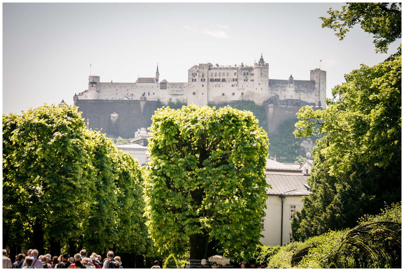 이렇게 보면 근경에는 미라벨 궁전 및 정원, 저 멀리에는 잘츠부르크 대성당의 첨탑, 그리고 산위에는 호엔잘츠부르크 요새가 보이게 되는 군요.