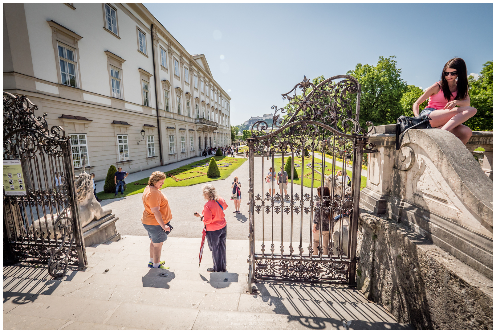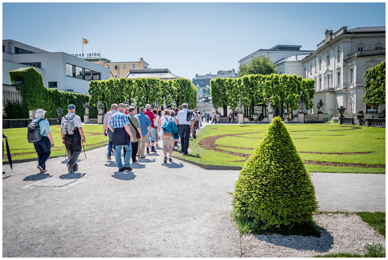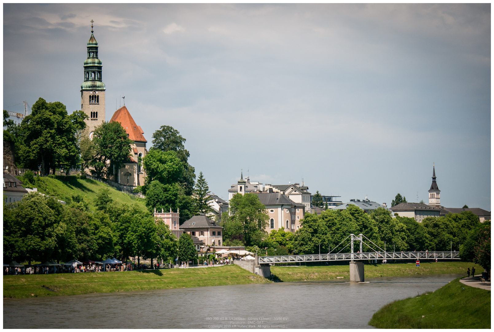 이렇게 보면 근경에는 미라벨 궁전 및 정원, 저 멀리에는 잘츠부르크 대성당의 첨탑, 그리고 산위에는 호엔잘츠부르크 요새가 보이게 되는 군요.