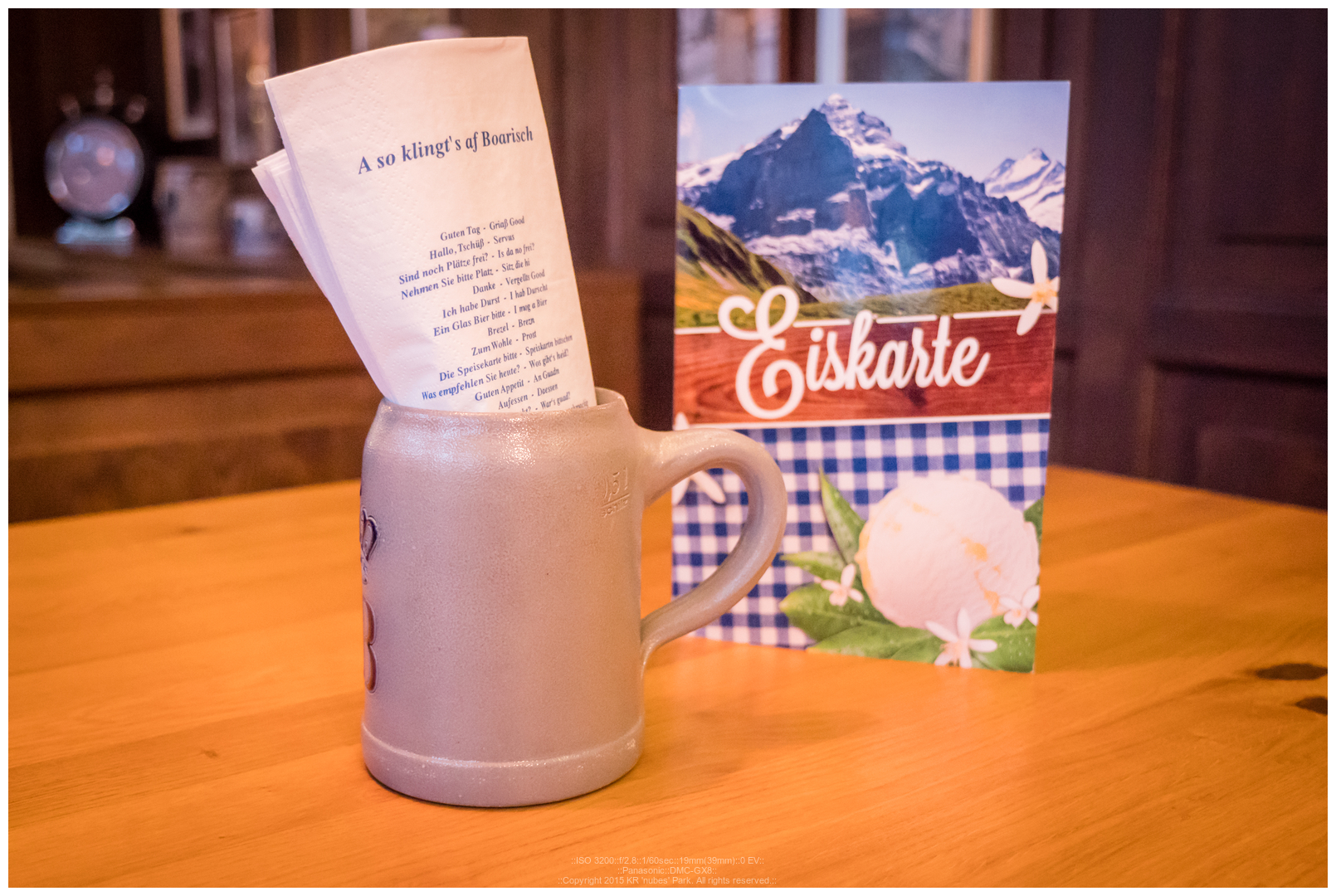 종이 냅킨에는 독일 표준말을 바이에른 특유의 사투리로 어떻게 말하는지를 소개하고 있네요.