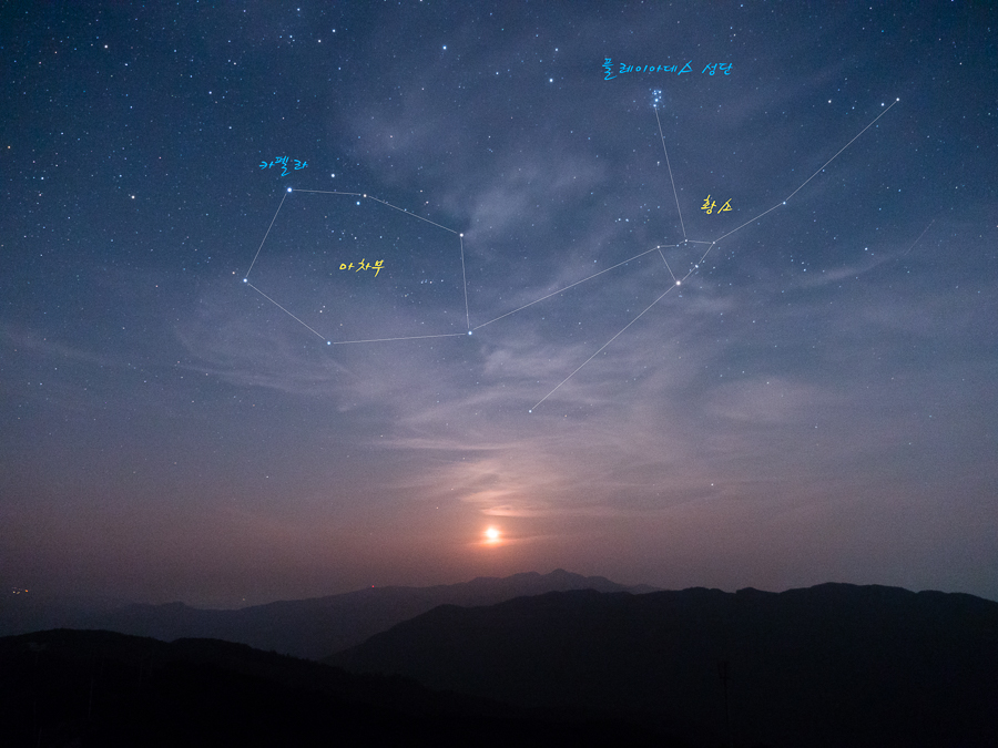 참고로, 카펠라는 북반구 하늘에서 3번째로 밝은 별이며, 플레이아데스 성단은 맨눈으로도 4~5개의 무리지은 별이 보입니다.