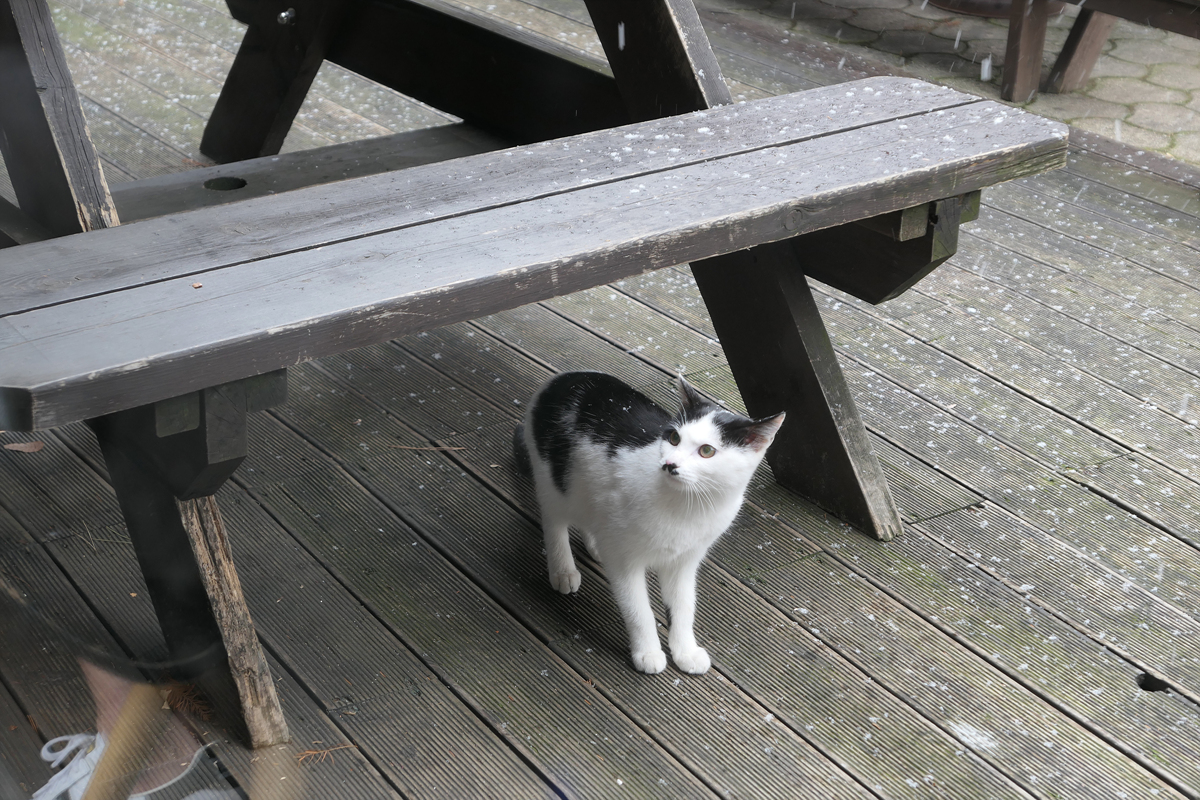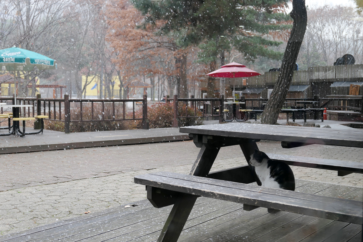 눈이 펑펑 오는 관계로 고양이도 눈을 피하고 있습니다.