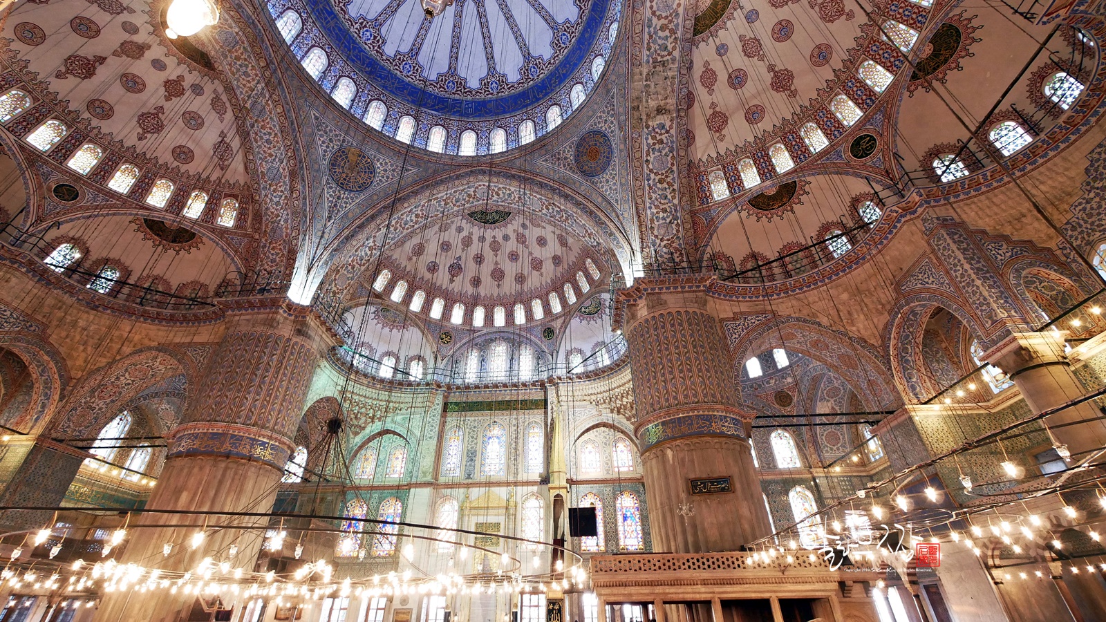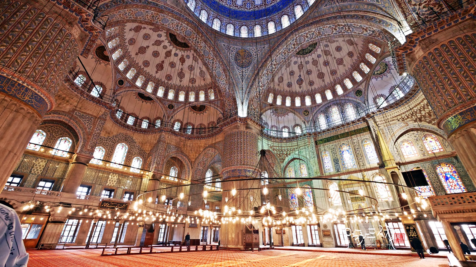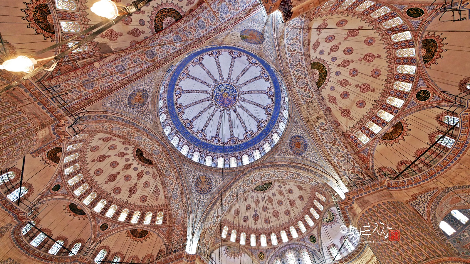모스크 내부는 약 2만 1,000개에 달하는 파란색의 이즈닉 타일과 푸른빛의 260개 유리창으로 장식되어 있는데, 서양 사람들은