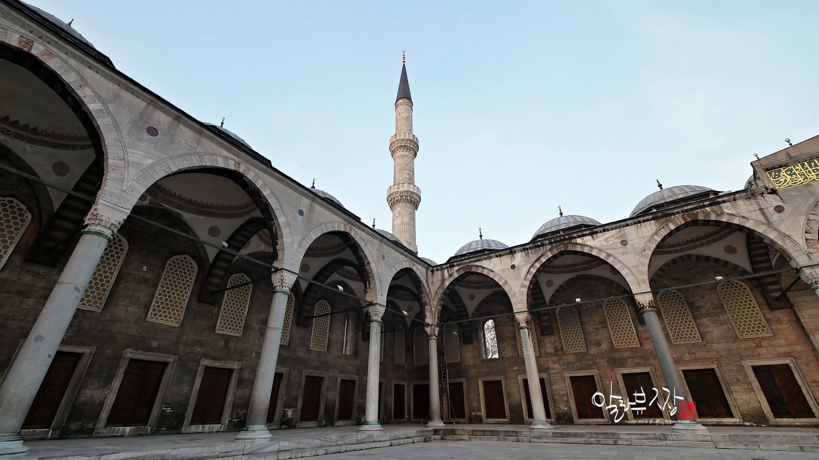 수많은 기둥이 받치는 각각의 아치 위에 작은 돔이 둥글게 솟았고, 4단을 이루며 돔 숫자는 점점 작아지다가 마지막 거대한 중앙 돔에 이른다.