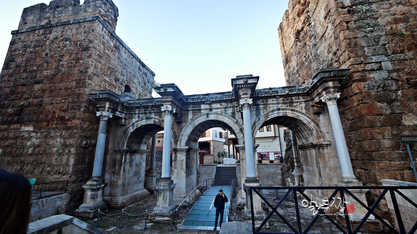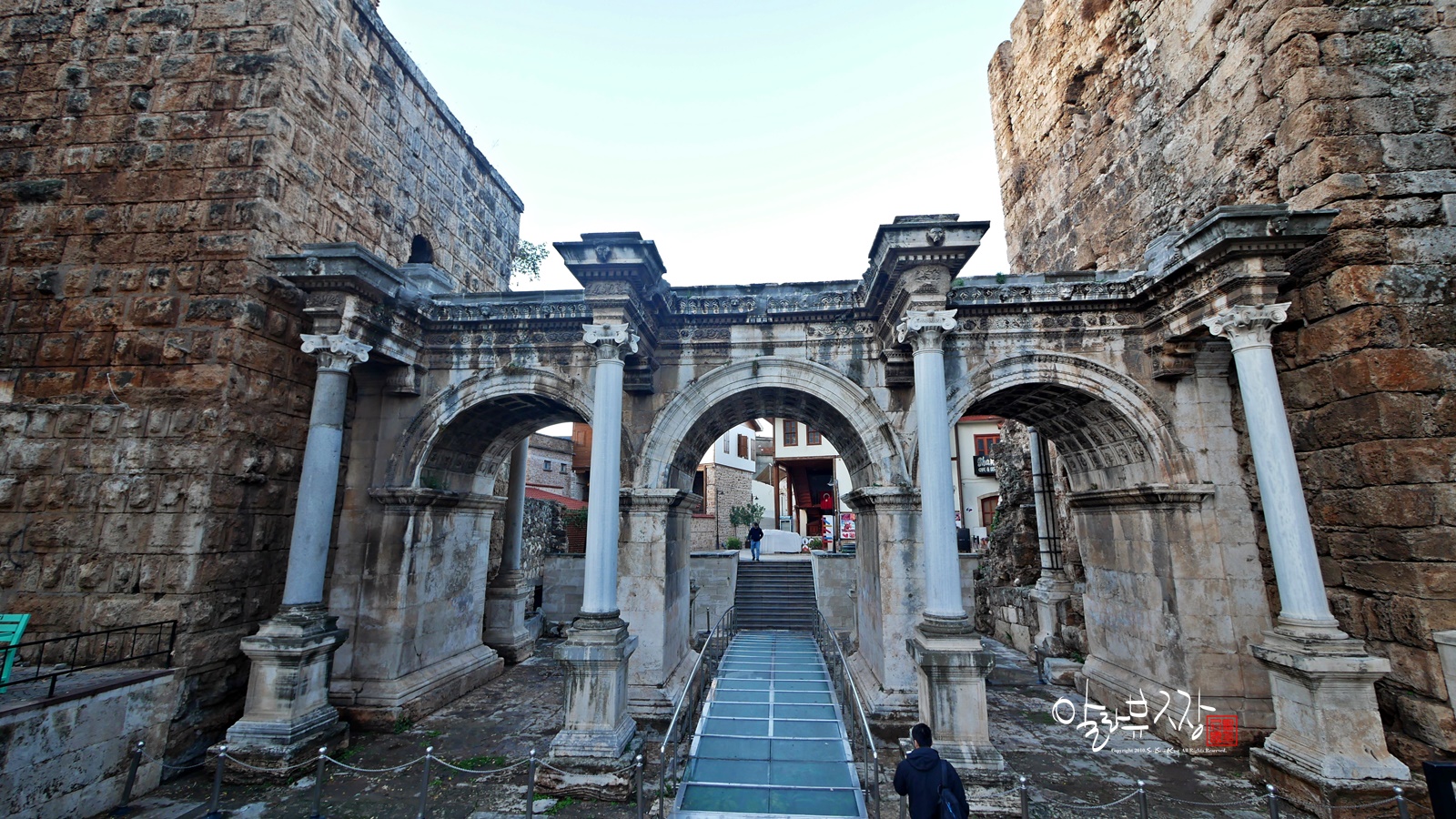 하드리아누스의 문 아래쪽으로 투명한 유리판 아래로는 고대에 만들어진 길 유적이 남아있어 보고지나가는 것이좋다