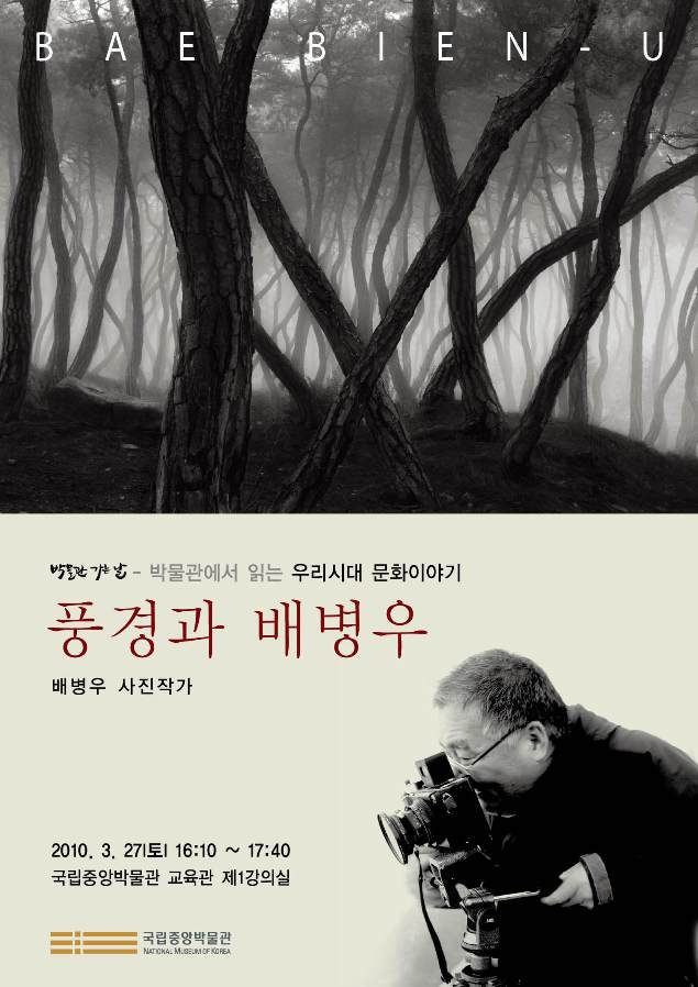 소나무 사진으로 잘 알려진 배병우 사진작가의 ‘풍경과 배병우’란 제목으로 자연을 담는 그의 작품세계와 종묘, 창덕궁과 같은 한국의 옛 건축물과 문화재를 바라보는 시각에 대하여 이야기하는 시간이 될 것입니다.