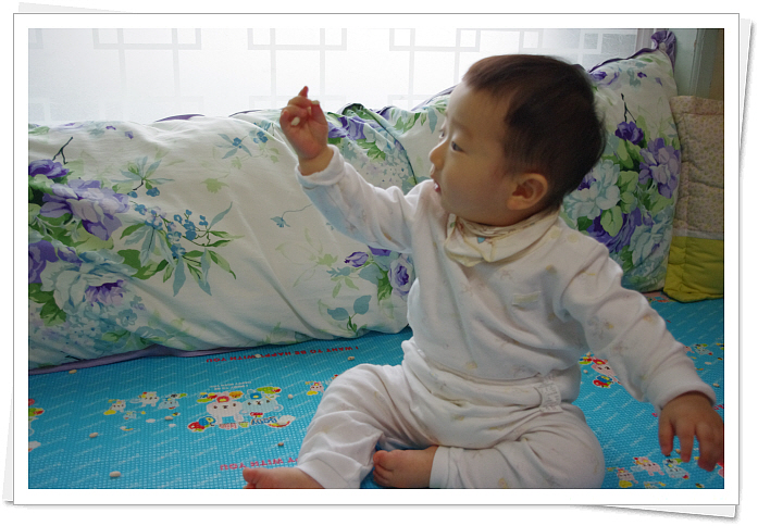 마눌님께서 교회에 갔는데 유아실에서 애기 엄마들이 지금 조그만 거 한참 집을 땐데 하빈이가 아직 그런 훈련이 안된거 같다고 하길래, 그날로 '초록마을'로 달려가 '튀밥'을 샀습니다. 그리고 바닥에 뿌려버리고, 그 가운데 하빈이를 앉혔더니.. 열심히 먹지는 않고 감정중입니다... 하는 표정이 얼마나 웃긴지 한컷 잡아봤습니다.ㅎ