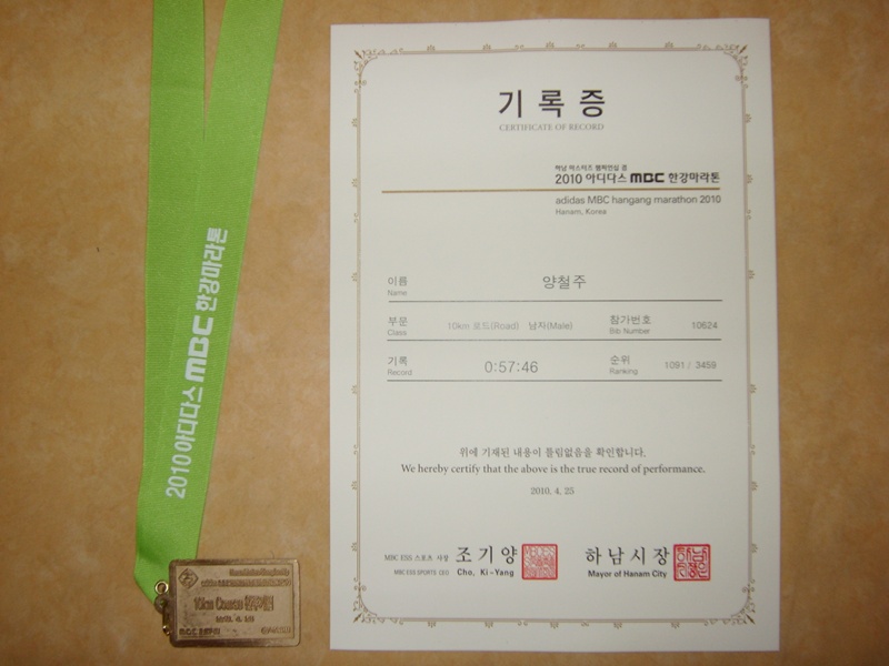 지난번 마라톤 대회 기록증이 날라왔네요. 뭐 처음 출전 한 것 치곤 한 시간 이내니까 잘 한거라고 하더군요. 근데 그날이후 한 번도 달리기를 하지 않더란..... ㅜㅜ 오늘 내일 쉬는데.... 비만 내려서....... 모두들 건강하세요. ^^
