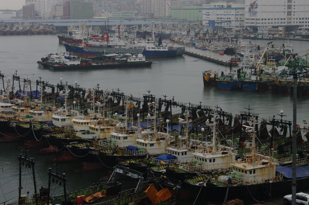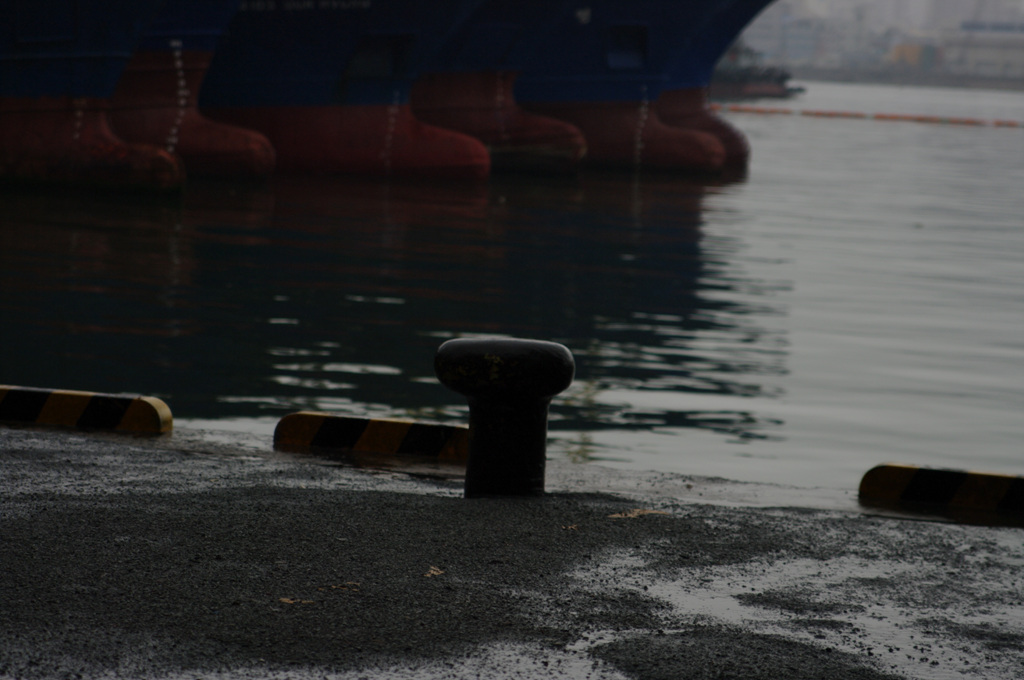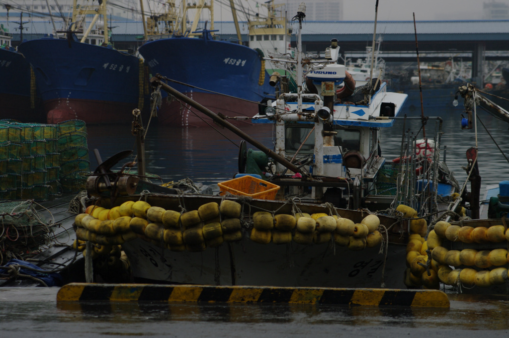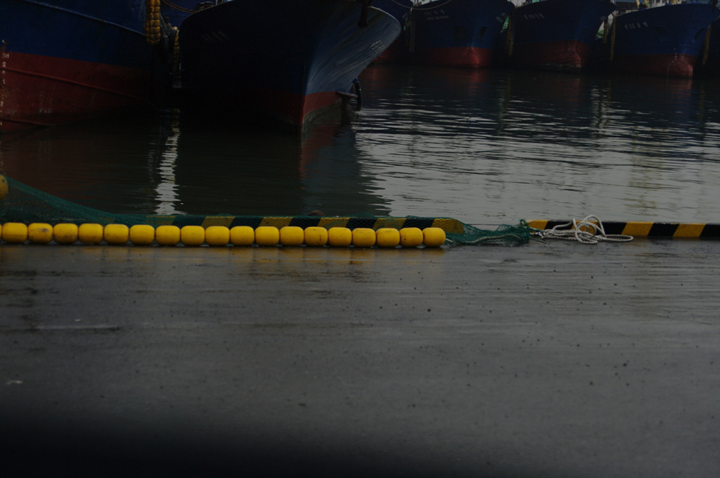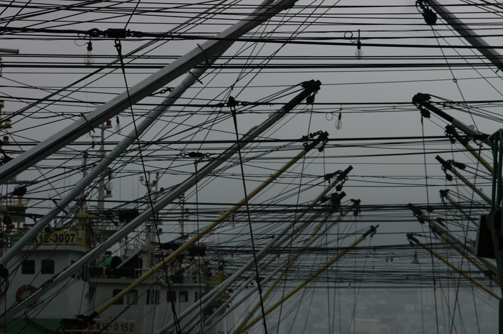 비가와서 발이 묶여버린 고깃배와 오늘 쉰다고 바닥에 퍼져있는 그물, 정신없이 얽혀있지만 사실은 모두가 제자리인 전선과 밧줄 등..