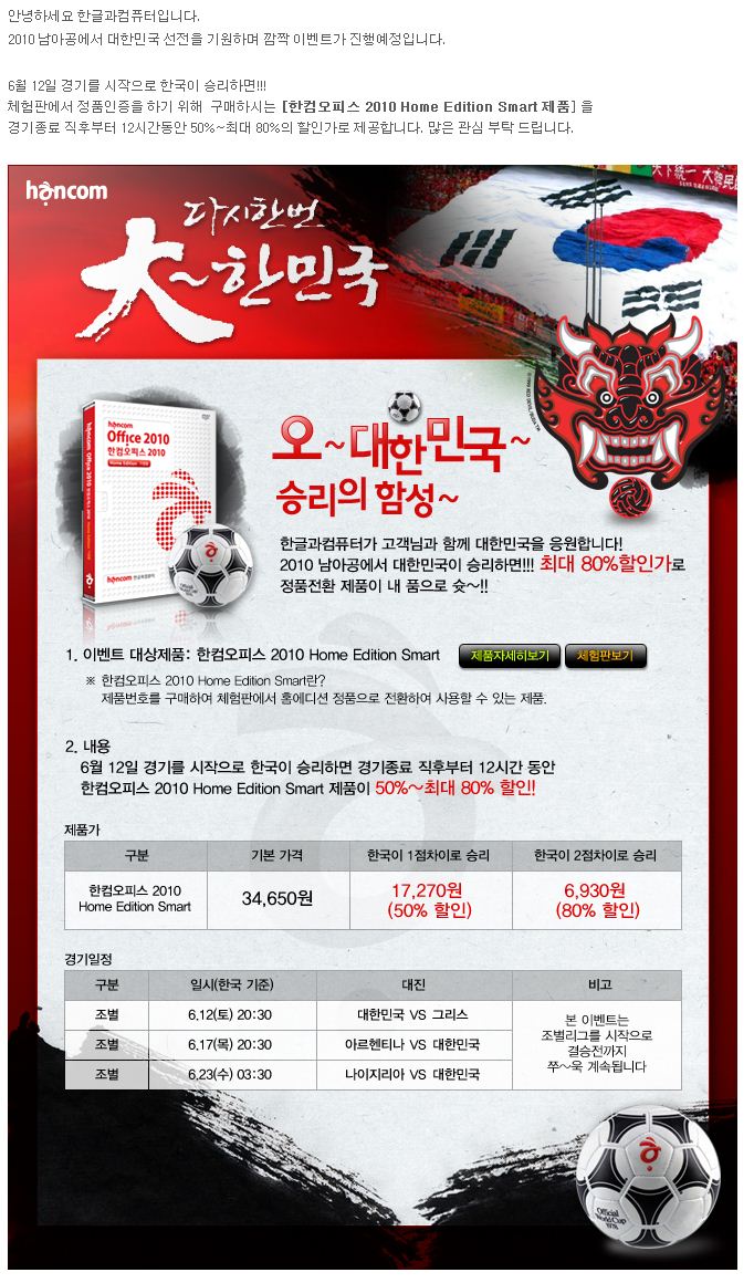 2점차 승리!! ㅋ...어제 축구는 안봤지만..요런 이벤트는 놓치면 안되지요.ㅎ 서버 트래픽 초과로 지금은 구매가 안되네요. 한컴 트위터에 공지사항 참고하시고 구매하세요~ [공지] 한컴샵 트래픽 증가에 대한 서버 보강 지연으로, 오늘 이벤트를 중단하고 16일(수) 오전 10시부터 오후10시 사이에 동일조건으로 이벤트를 재개하겠습니다. 이미 구매하신 분들은 그대로 인정입니다. 감사합니다.