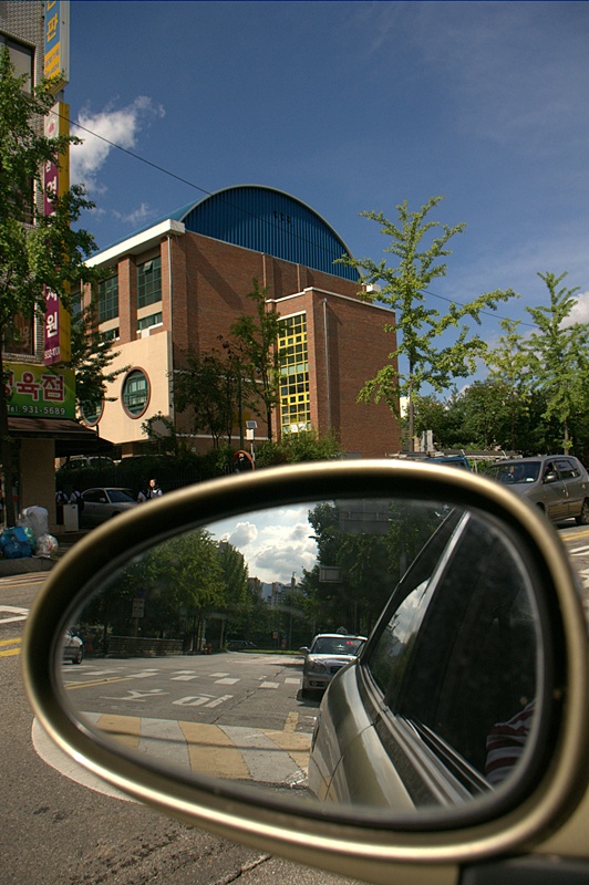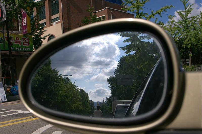 차에서 거울을 통해 찍은 사진인데
