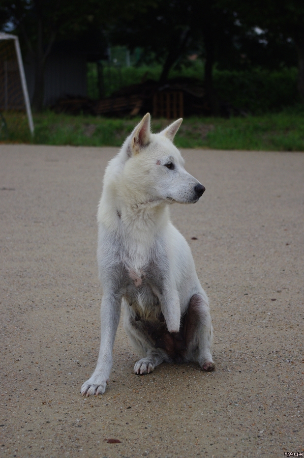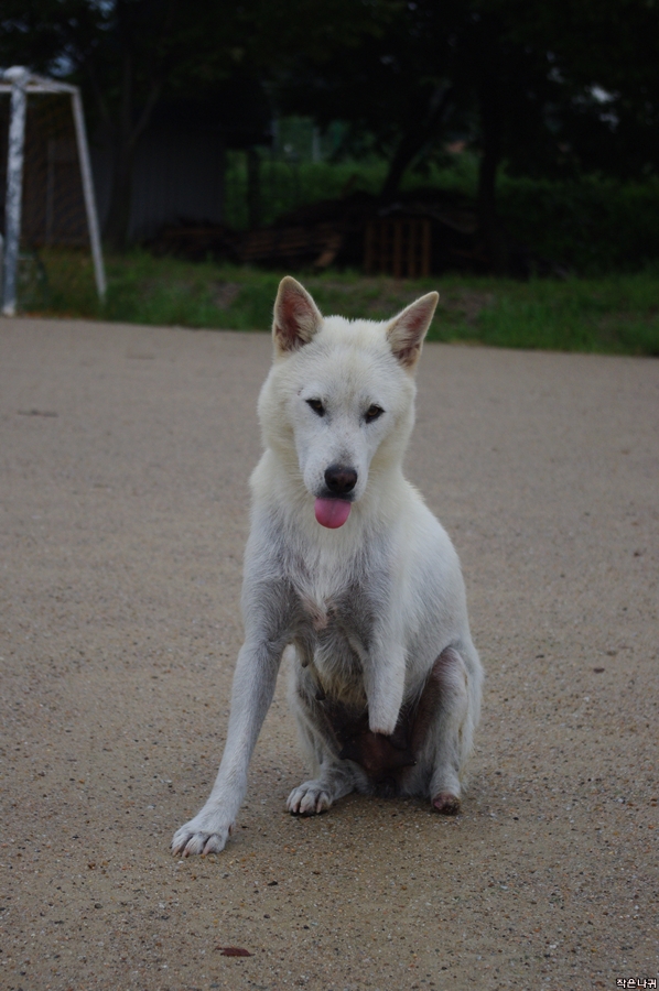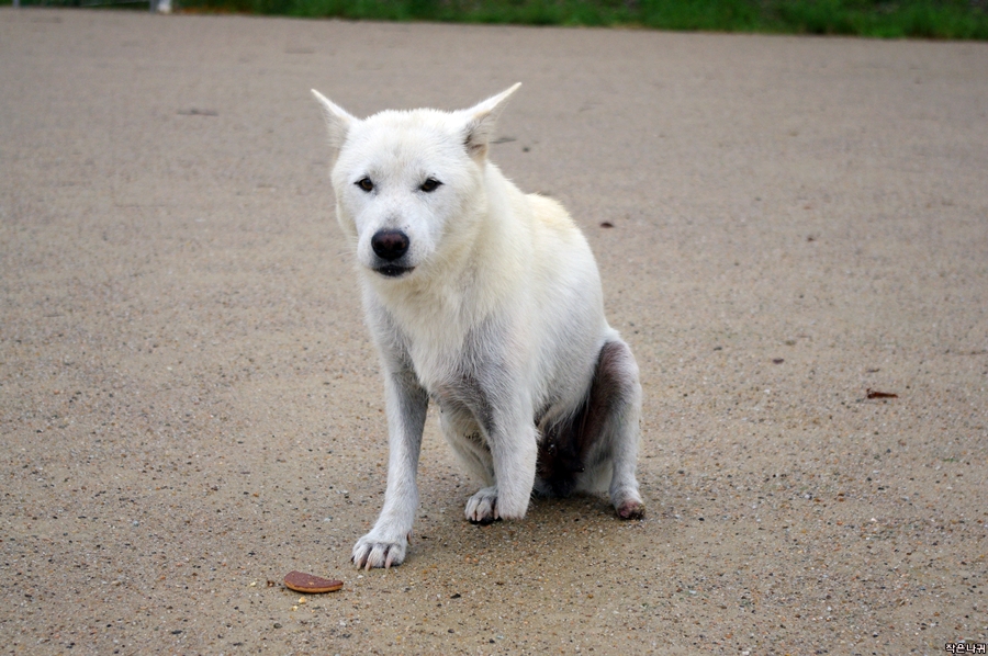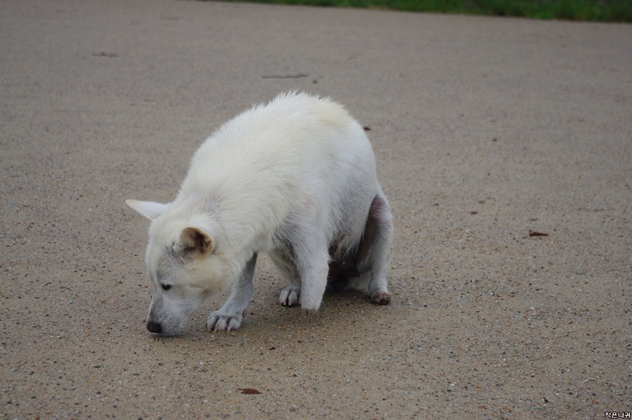 강아지 몸 상태를 보면 약간 피부병, 영양실조, 앞다리 절단면에 피가 묻어 있고....ㅠㅠ
