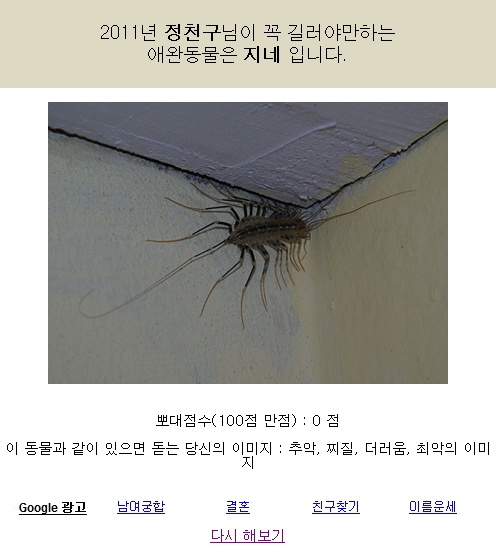 이건... 너무 하네요... 1점도 아니고... 아무리 평소에 절지류, 곤충을 좋아한다지만... (게다가 나온 이미지는 지네도 아니고, 그리마... ) 추악, 찌질, 최악.ㅋㅋㅋㅋㅋㅋㅋㅋㅋ ㅠㅜ