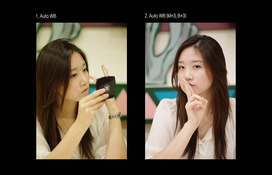 실내에서 누렇고 그린틱한 사진이 나오는 경우가 있어 세밀하게 색상을 조절해본 것입니다. 기본에서 M3, B3... 상황에 따라 다르지만 녹색끼가 제거되고 붉기가 많아지죠 여기서 M을 조금 더 약하게 세팅하면 괜찮을것 같다는 생각이 드네요 액정으로 미리 보는 색감이 실 사진과 큰 차이가 없는 것 같아 괜찮습니다... 액정의 밝기는 약간 어둡거나 밝은 경향이 느껴지기도 합니다만...