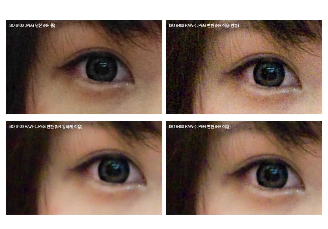 크롭 비교샷은 ISO6400 실내 인물 샘플을 JPEG 원본 크롭, 그리고 RAW 보정 방법에 따라 디테일 변화를 몇 개 비교 해본 것입니다.
