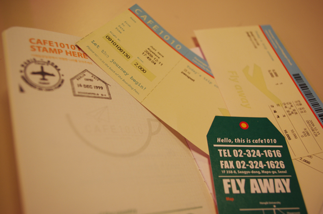 cafe 10X10 의 특이한 점은 영수증이 저렇게 티켓처럼 나오고, 1000원을 추가하면 스탬프 적립 카드를 여권형식으로 만들어줘요.