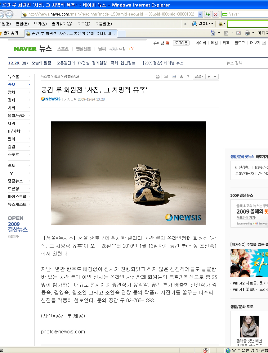 슈마의 사진이 네이버에 등록되었답니다. ^^ 공간루에서 공식적인 단체전은 첫번째로 제 사진이 뉴스에 올라가는건 처음이네요~^^;;; news.naver.com/main/read.nh... 누르시기 힘드실꺼 같아서.. 캡쳐도 해놨어요~ ㅋㄷㅋㄷ
